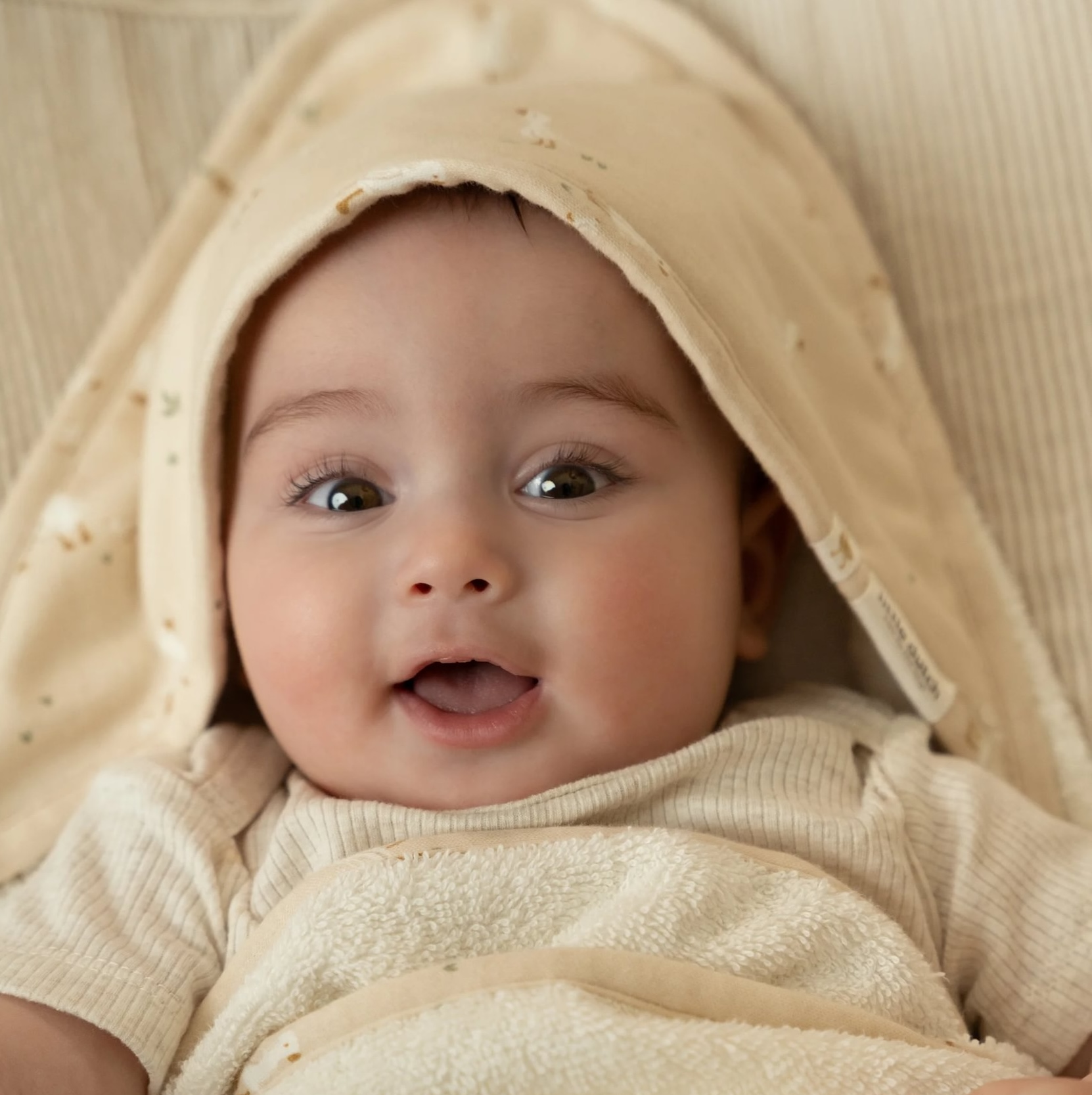 Měkká froté osuška s kapucí z jemné organické bavlny je ideální pro snadné a rychlé osušení a zabalení dítěte po koupeli.