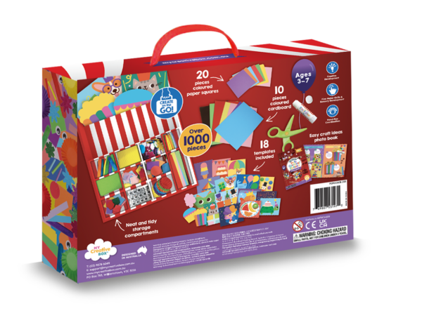 Uvnitř vaší soupravy naleznete knihu s nápady na tvoření plnou inspirace spolu s více než 1000 dílky včetně lepidla, nůžek schválených na letišti, australských ilustrovaných šablon, praktické umělecké tabule a základních uměleckých pomůcek. Vše, co potřebujete pro hodiny tvorby senzorických koláží, úhledně zabaleno v pevné, organizované přenosné krabici.
