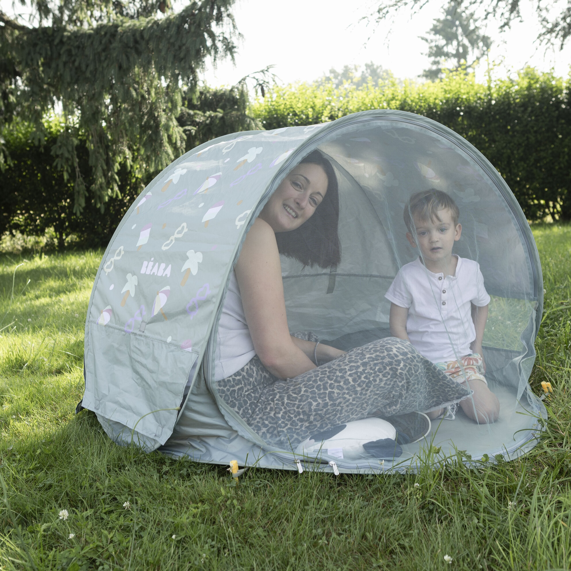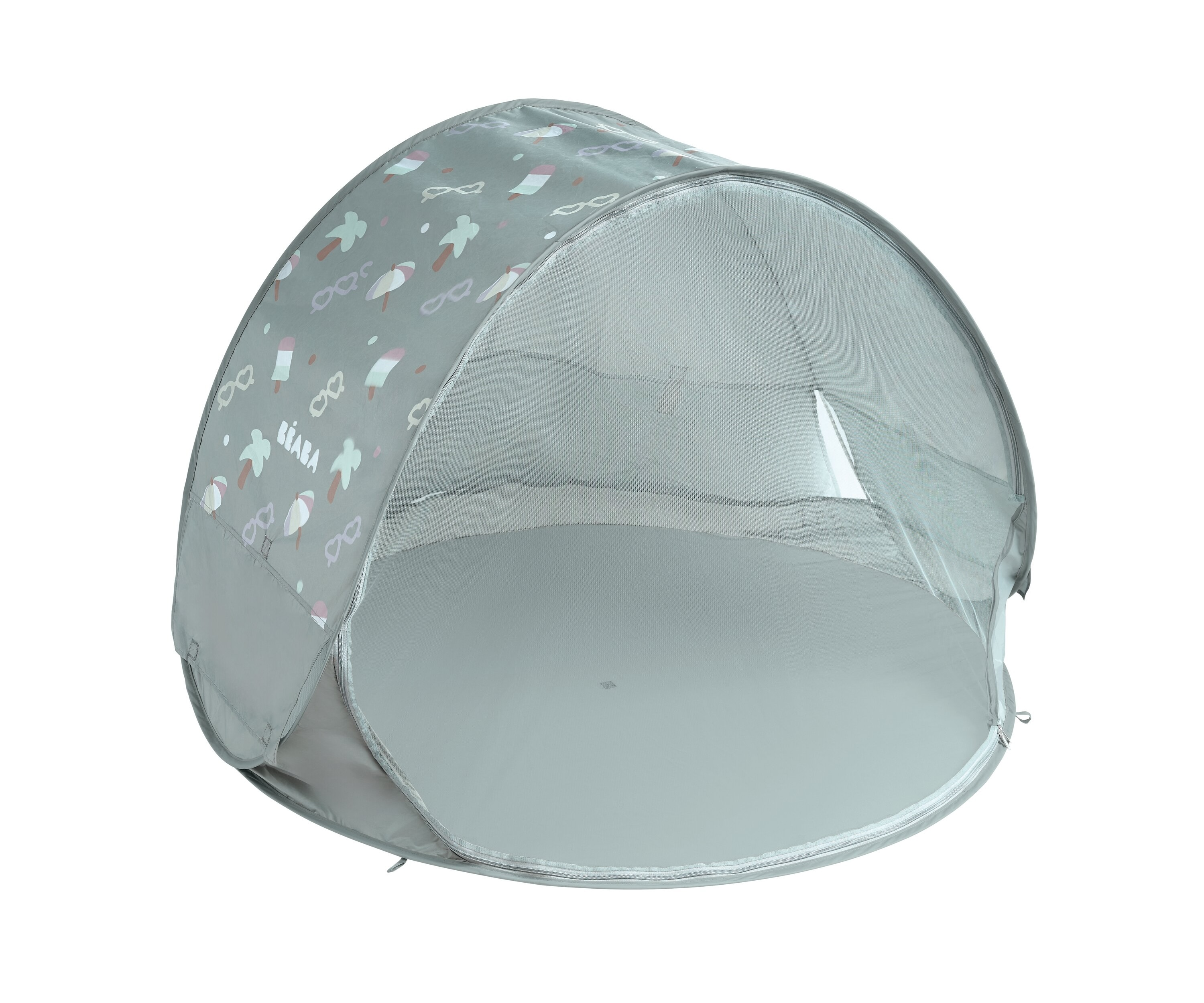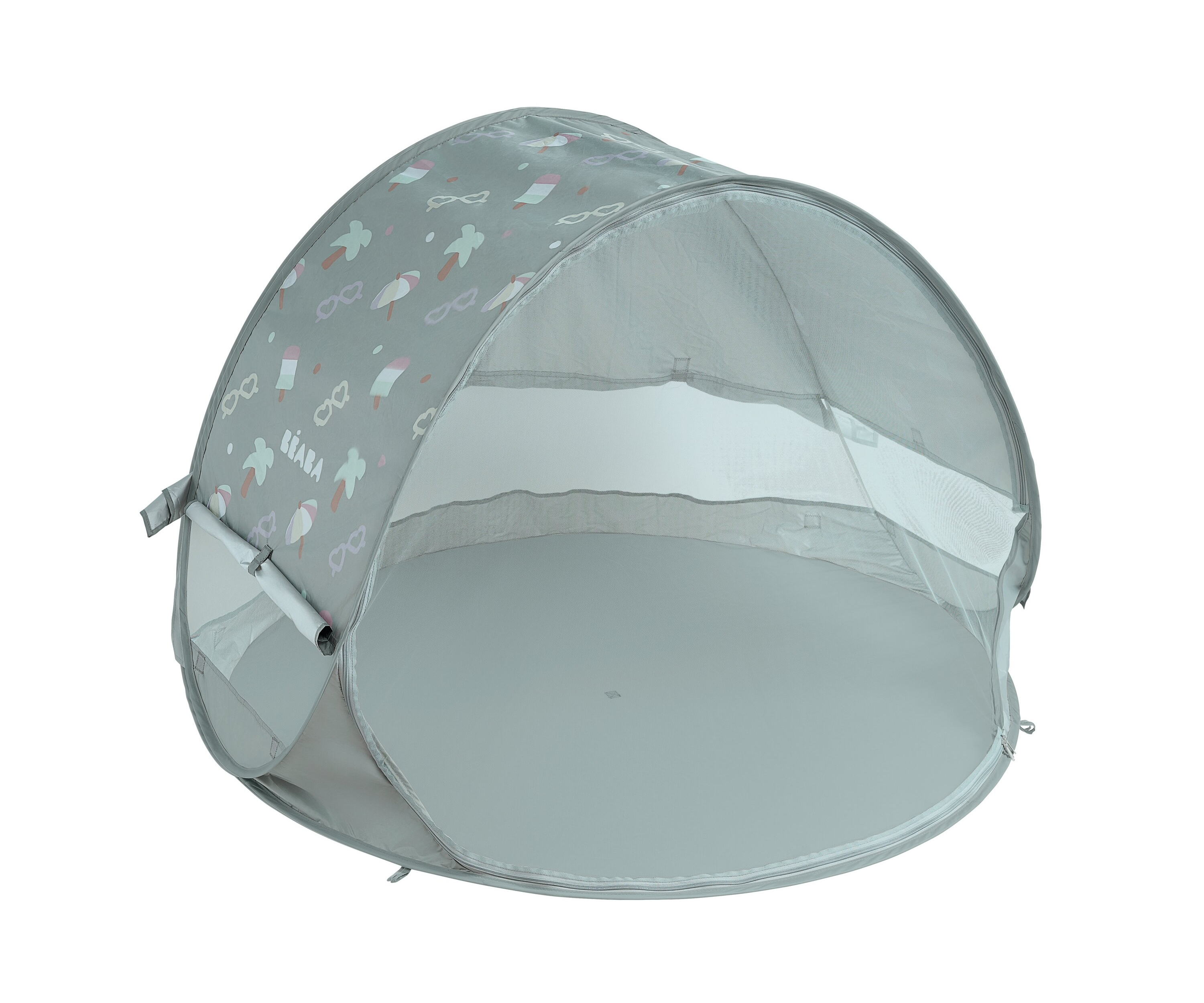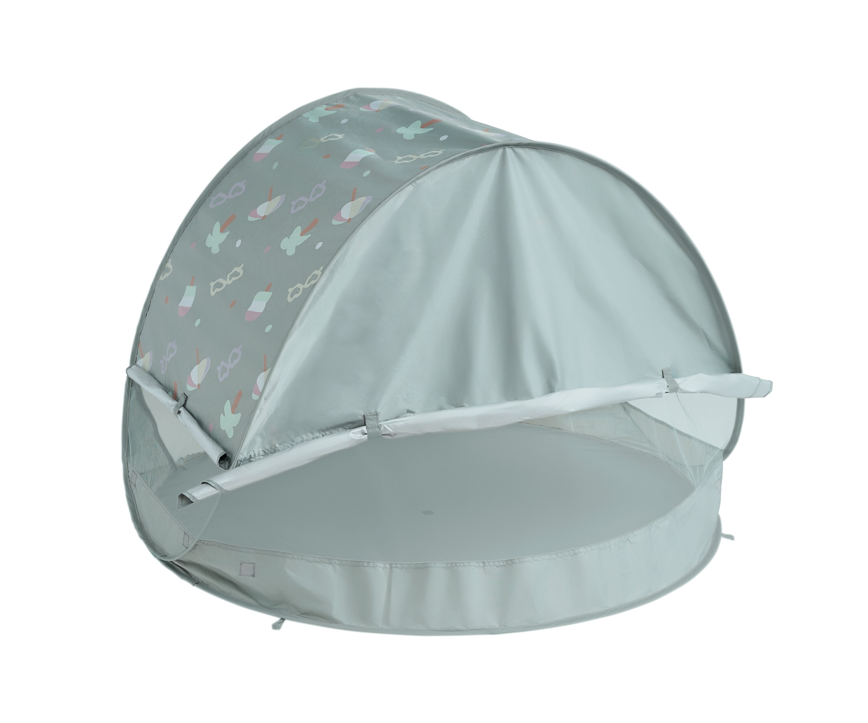Přenosný univerzální stan s UV faktorem 50+ pro ochranu dítěte před sluncem na zahradě, na pláži či na výletech do přírody. Stan umožňuje snadnou ventilaci díky bočním otvorům se síťovinou a textilními chlopněmi, které je možné srolovat. Síťovina chrání dítě ve stanu před obtížným hmyzem.