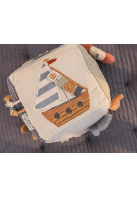 Měkká plyšová kostka Little Dutch z kolekce Námořnický záliv obsahuje krásné motivy ze života na moři a nabízí mnoho aktivit, které stimulují smysly dětí. Je toho tolik k objevování a hraní: různé textury, bezpečné zrcátko a chrastítko, která vydává zvuk při každém pohybu.