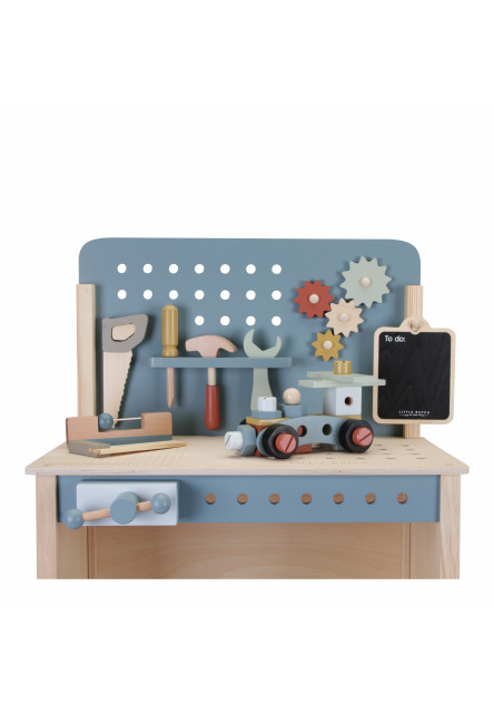 Dětský ponk pro malé kutily v kvalitním dřevěném provedení s nářadím a dalším příslušenstvím. Děti si mohou z jednotlivých dílů sestavit třeba autíčko nebo opravit, cokoli je potřeba. Kompletní sada se skládá z 55 dílů včetně dětského kladívka, klíče, šroubováku, matic a šroubů.
