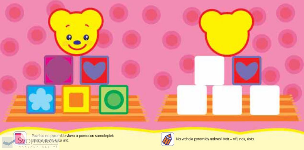 Pozri sa na pyramídu vľavo a zo samolepiek dotvor rovnakú vpravo. Dokresli medvedíkovi tvár. Nalep d...zobrazit více