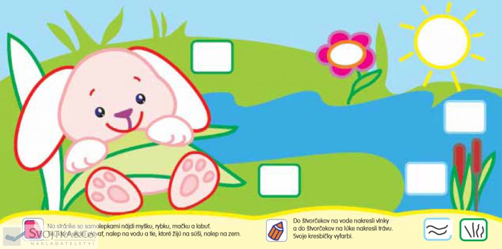 Pozri sa na pyramídu vľavo a zo samolepiek dotvor rovnakú vpravo. Dokresli medvedíkovi tvár. Nalep do rybníčka tie zvieratká, ktoré plávajú, a na breh tie, ktoré žijú na súši. Dokresli vlnky na vode a trávu na brehu. Spoj psíkov s búdami, v ktorých bývajú a dokresli im do misiek jedlo. Pomôž mačiatkam nájsť ich mamičky a dokresli im na hranie farebné klbká vlny. Dokresli dievčatku ďalšie nafukovacie balóniky. Tieto úlohy a ešte veľa ďalších nájdete v tejto knižke, ktorá je určená pre najmenšie deti od 2 do 3 rokov. Hravou formou si tu precvičia ruku pri domaľúvaní a zistia aj svoju šikovnosť a postreh pri plnení jednoduchých úloh a pri výbere a nalepovaní samolepiek.Počet strán: 12 str. + 4 samolep.