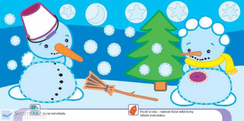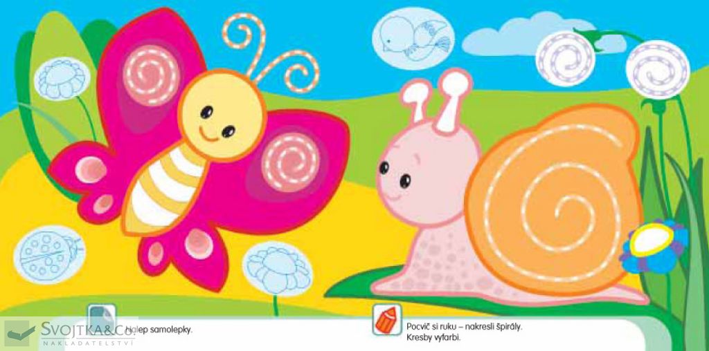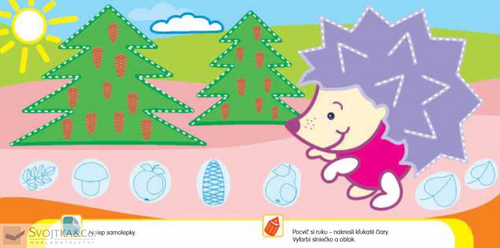 Domaľuj dážď – zvislé čiary. Domaľuj gitaristovi struny – vodorovné čiary. Domaľuj ježkovi špicaté ostne – kľukaté čiary. Domaľuj snehuliakom bruchá – krúžky. Domaľuj dúhu – oblúčiky. Domaľuj motýlikovi krídla – špirály. Domaľuj ovečke huňatý kožúšok – vlnovky. Dolep samolepky na správne miesta. Tieto úlohy a ešte veľa ďalších nájdete v tejto knižke, ktorá je určená pre najmenšie deti od 2 do 3 rokov. Hravou formou si tu precvičia ruku pri domaľúvaní a zistia aj svoju šikovnosť a postreh pri plnení jednoduchých úloh a pri výbere a nalepovaní samolepiek.Počet strán: 12 str. + 4 samolep.