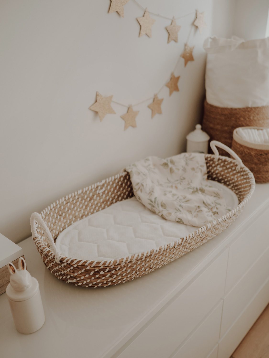 Přebalovací košík pro miminko Smart Basket Natural od značky Ahojbaby je dodávaný včetně přebalovací podložky.