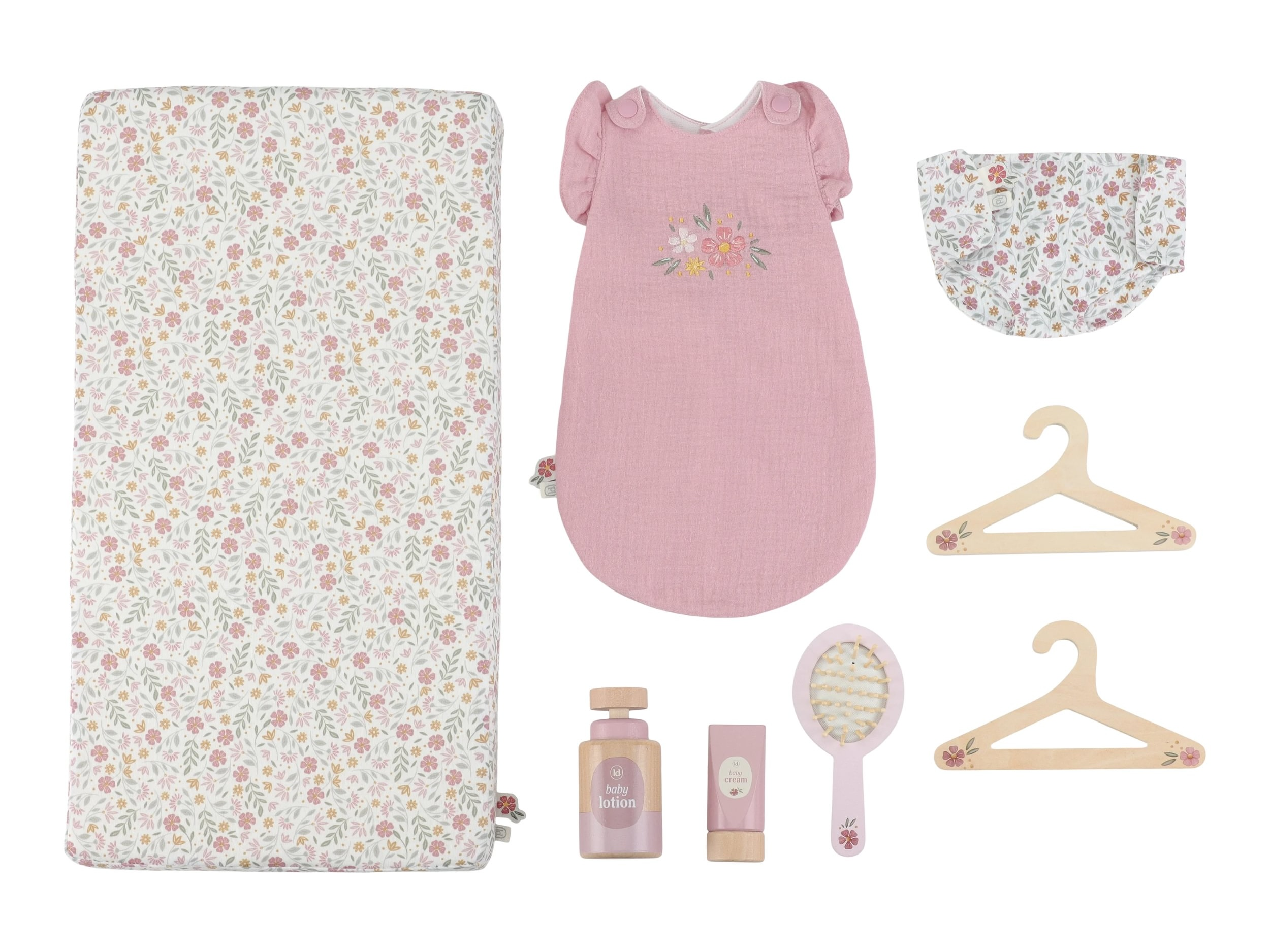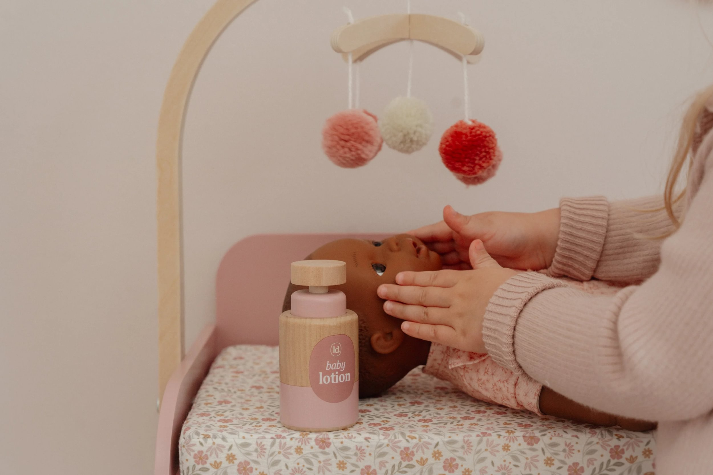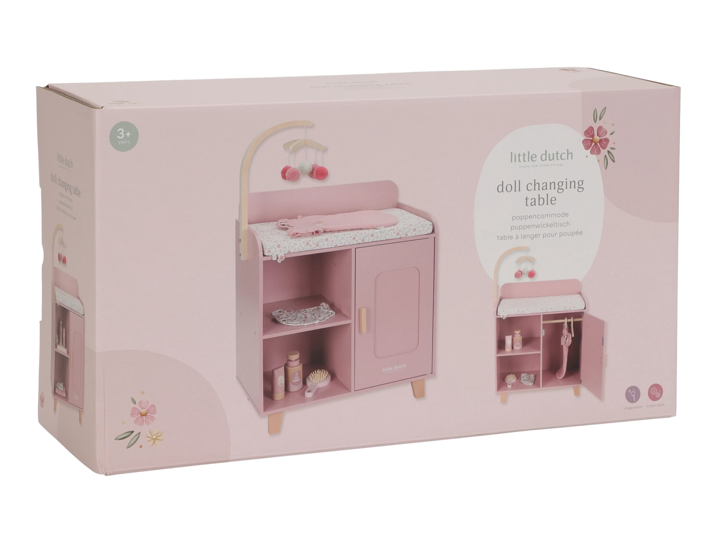 Elegantný prebaľovací pult Little Dutch umožňuje deťom napodobňovať každodennú starostlivosť o bábätko a starať sa o bábiky rovnako, ako sa mamička či otec starajú o svoje bábätko. Súčasťou balenia je mäkká prebaľovacia podložka s romantickou kvetinovou potlačou, závesný kolotoč, spací vak, textilná plienka, dve ramienka a drevené doplnky pre starostlivosť o bábiku. Praktická skrinka a poličky v spodnej časti prebaľovacieho pultu umožňujú mať všetko potrebné pre starostlivosť o bábiku vždy po ruke a upratané.