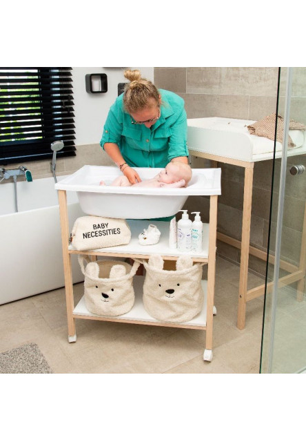 Dvoudílná sada přebalovacího pultu a vaničky na koupání je navržena tak, aby vám zjednodušila každodenní přebalování a koupání miminka. Vaničku díky kolečkům s možností zabrždění snadno umístíte pod přebalovací pult pro úsporu místa během dne. Lišta u přebalovacího pultu umožňuje zavěšení ručníku či pleny.