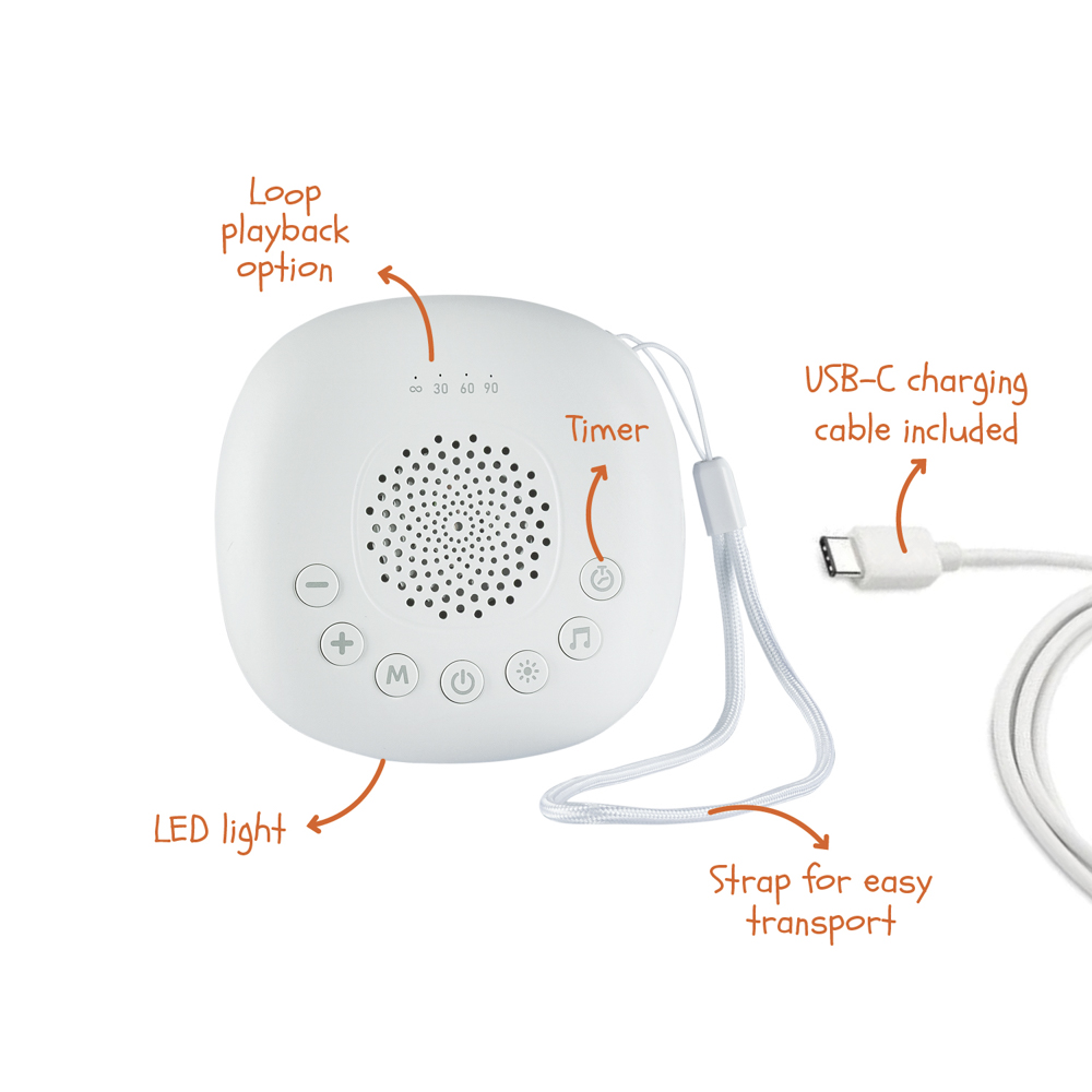 • Až 20 upokojujúcich melódií: biely šum, tlkot srdca, oceán, dážď, kvapky, spev vtákov, letná noc, uspávanky a ďalšie• LED svetlo s farebným prechodom – jemné nočné osvetlenie s možnosťou výberu farby• Jednoduché ovládanie jednou rukou – intuitívne tlačidlá s ikonami pre zvuk, svetlo, hlasitosť a časovač• Časovač na 30 / 60 / 90 minút alebo nepretržité prehrávanie• Možnosť prehrávania zvukov v slučke – ideálne na celonočné použitie• Pútko na zavesenie na postieľku, kočík alebo kamkoľvek inam• Nabíjanie cez USB-C, kábel je súčasťou balenia• Kompaktný rozmer 100 × 100 mm – ideálny aj na cestovanieKľúčové vlastnosti