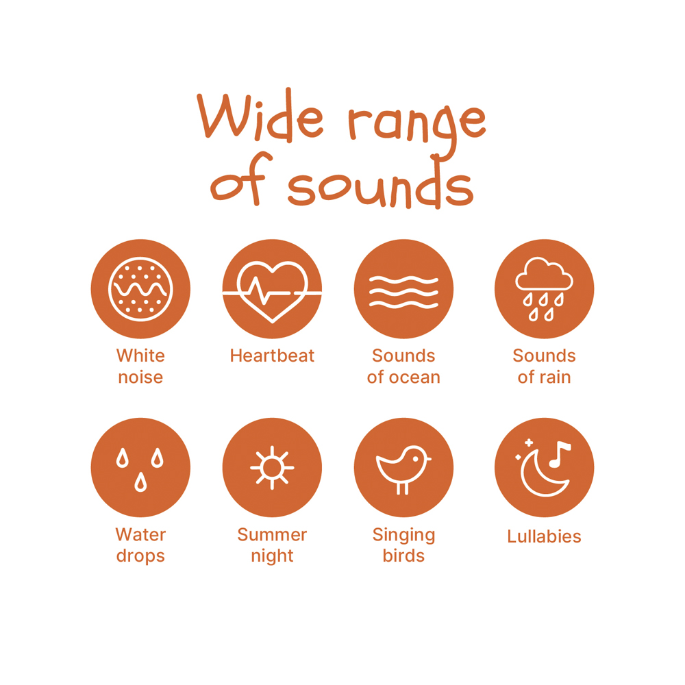 • 20 typov zvukov vrátane bieleho šumu a prírodných melódií• Možnosť prehrávania v slučke• Nastaviteľná hlasitosťOsvetlenie:
