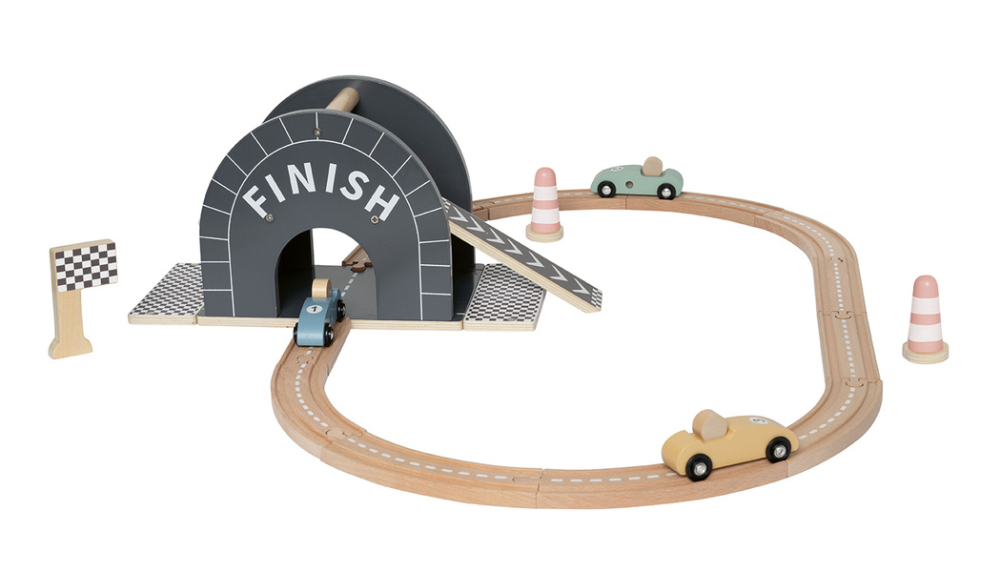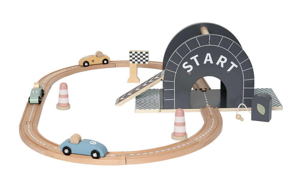 Naštartujte motory a pripravte sa na preteky plné akcie! S touto štýlovou a hravou drevenou pretekárskou dráhou môžu deti vytvárať svoje vlastné závodné dobrodružstvá – od štartu až do cieľa. Dráha je navrhnutá ako oválny okruh s plynulými zákrutami, cestnými značeniami a viacúrovňovou rampou, po ktorej autíčka svištia plnou rýchlosťou. Štyri farebné pretekárske autá sú pripravené na štart a pomocou kužeľov a šachovnicovej vlajky sa okamžite vytvorí pravá závodná atmosféra.