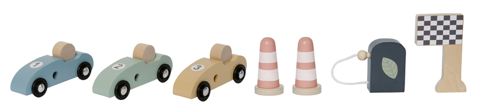 Celý set je vyrobený z dreva, má nadčasový dizajn a jemné tlmené farby, ktoré krásne zapadnú do každého detského izbičky. Deti si pri hre precvičujú jemnú motoriku, spoluprácu a zároveň nechávajú priestor fantázii. Ideálne pre malých milovníkov rýchlosti od 3 rokov – či už ide o priateľské preteky alebo napínavý šampionát. Pretekárska dráha je zábavná, odolná a vizuálne pútavá hračka, ktorá podporuje pohyb, tvorivosť a predstavivosť každý jeden deň.