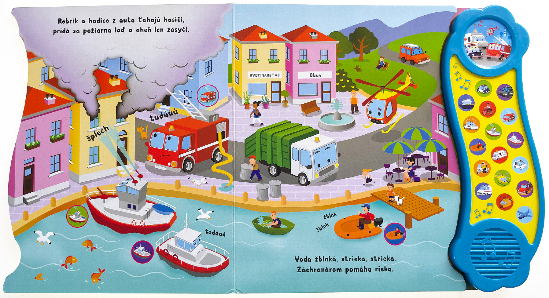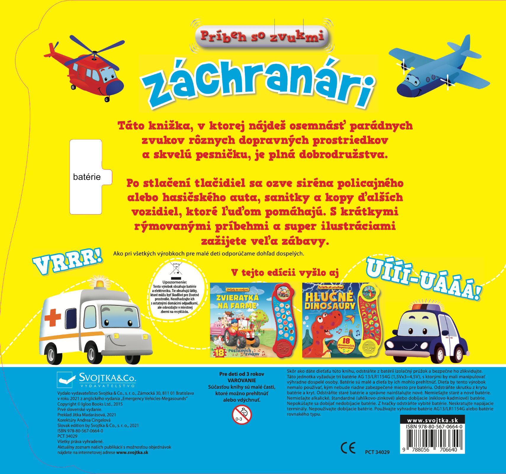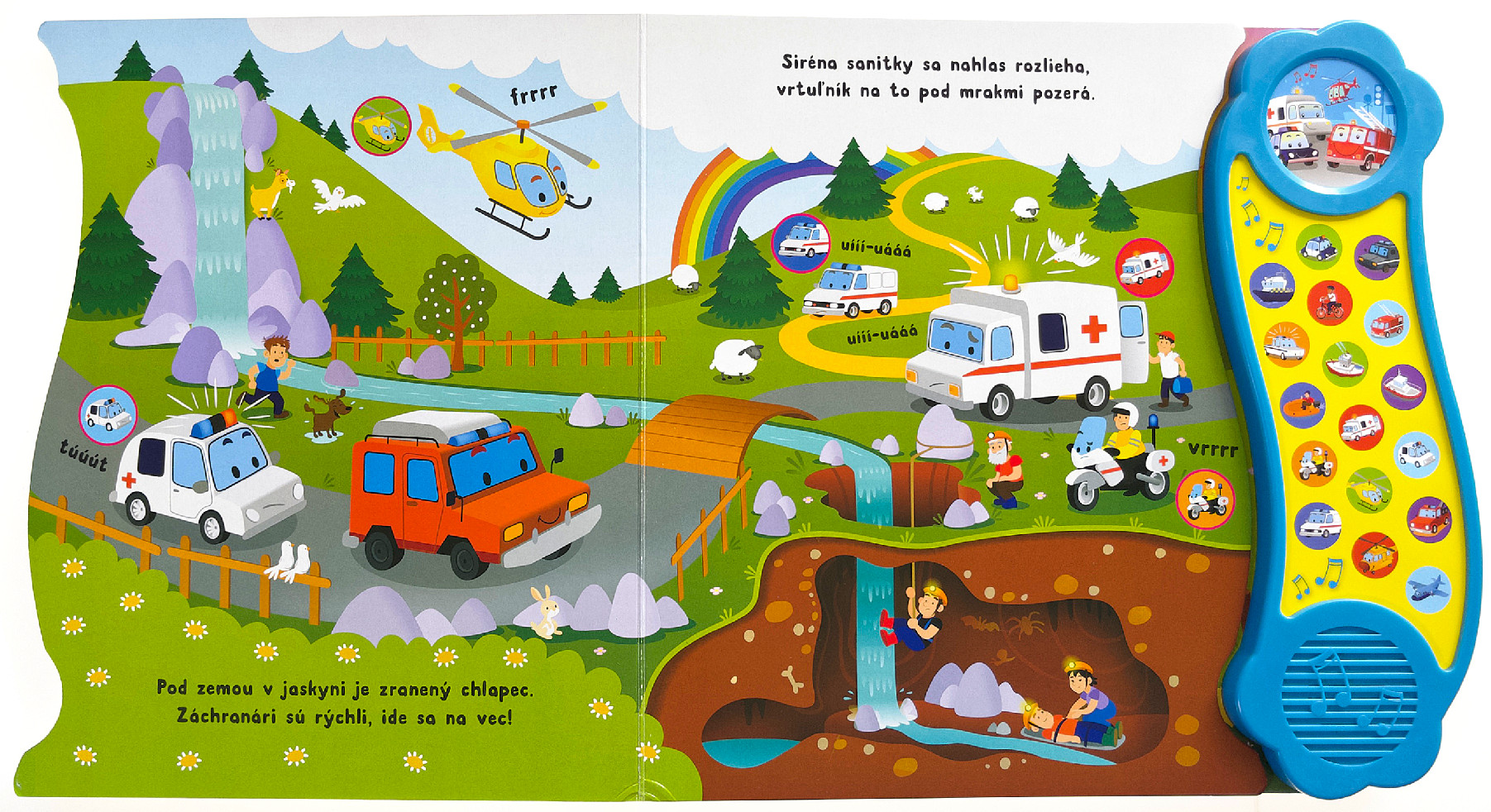 Uííí-Uááá, húka modrobiele policajné auto. Tadááá, trúbi policajný čln. Húúú, húka sanitka – táto interaktívna zábavná knižka s veselými celostránkovými ilustráciami obsahuje krátke dobrodružné a rýmované príbehy. Ale hlavne – 18 parádnych zvukov rôznych dopravných prostriedkov! Vaše deti si obľúbia čítanie príbehov doplnené o stláčanie tlačidiel so zvukovými efektmi! Stačí len nájsť zodpovedajúci obrázok a stlačiť... Ozve sa siréna policajného alebo hasičského auta či sanitky a hŕba ďalších vozidiel, ktoré ľuďom v zložitých situáciách pomáhajú. Ale aj v knižke raz deň končí, a tak dnes už žiadne húkačky! Bol to veľmi dlhý, rušný deň a záchranárske autíčka nemôžu húkať stále. Musia tiež spať, aby zajtra mohli zase von a pomáhať! Kniha obsahuje tri výmenné batérie.Počet strán: 8