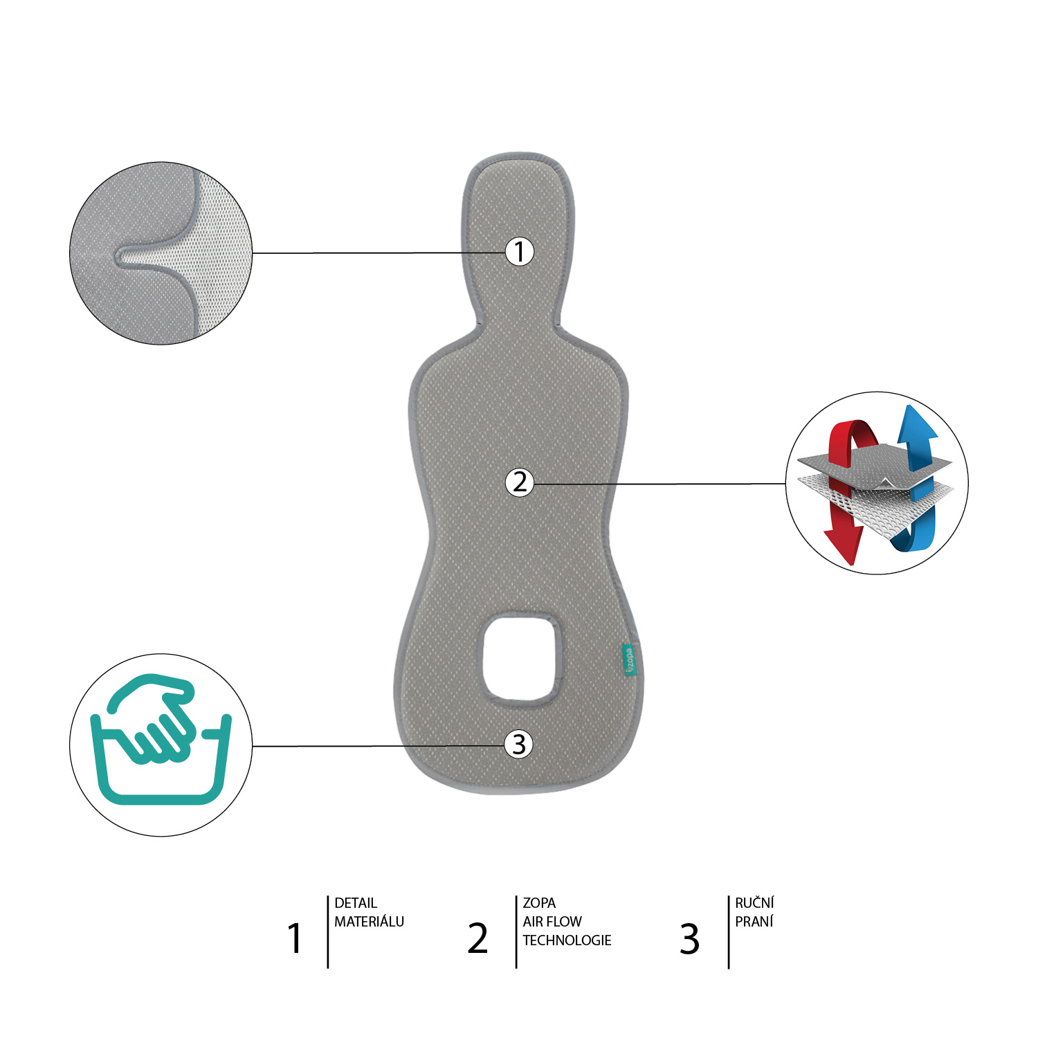 Priedušnosť zaisťuje unikátna technológia Zopa Air Flow, látka s 3D hexagon štruktúrou dovoľujúci prúdenie vzduchu cez vložku, medzi autosedačkou a dieťaťom.