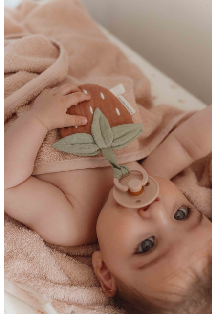 Přívěsek z jemného mušelínu v podobě jahůdky s úchytem pro šidítko láká dítě ke hraní i zkoumání a rodičům pomůže rychle najít šidítko v postýlce či kočárku.