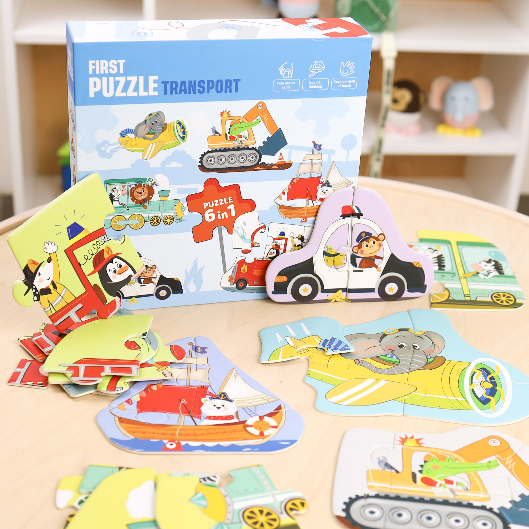 První puzzle Doprava 6v1Svět dopravy s veselými zvířátky – ideální první puzzle pro malá držadla!Objevte První puzzle pro děti Doprava 6v1 – hravý a vzdělávací set, který pomáhá rozvíjet dětskou dovednost, logiku a koncentraci. Balení obsahuje až 6 různých puzzle – 6 úrovní obtížnosti, od 2 až po 6 dílků, takže jsou ideální i jako první puzzle pro nejmenší.Děti si při skládání užijí spoustu zábavy s veselými zvířátky, která řídí policejní auto, loď, bagr, letadlo, hasičské auto a vlak. Každé puzzle má barevně odlišenou zadní stranu, což dětem usnadňuje třídění dílků a podporuje samostatné skládání.Vhodné pro děti již od 2 let, které se učí spojovat tvary a obrázky poprvé.6 puzzle v jednom balení – radost, učení a rozvoj v každém dílkuPodporuje jemnou motoriku, koordinaci oko-ruka a logické myšleníVyrobeno ze silného, tvrzeného kartonu – odolné a bezpečné pro malé dětiKvalitní ilustrace se zvířátky v sytých barvách, které děti zaujmou na první pohledErgonomické dílky, které se snadno chytají i nejmenším ručkámSkvělý tip na dárek pro malé milovníky dopravních prostředků