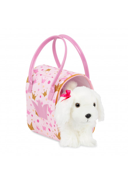 Roztomilé plyšové štěně v kabelce s krásným potiskem je vždy připravené na mazlení i na procházku. Miluje vyčesávání své hebké srsti hřebínkem a díky kabelce si jej vaše dítě může vzít kamkoli. Kabelka má průhlednou přední stěnu ze síťoviny s otevíráním na zip, aby štěňátko při přenášení vidělo na svět.