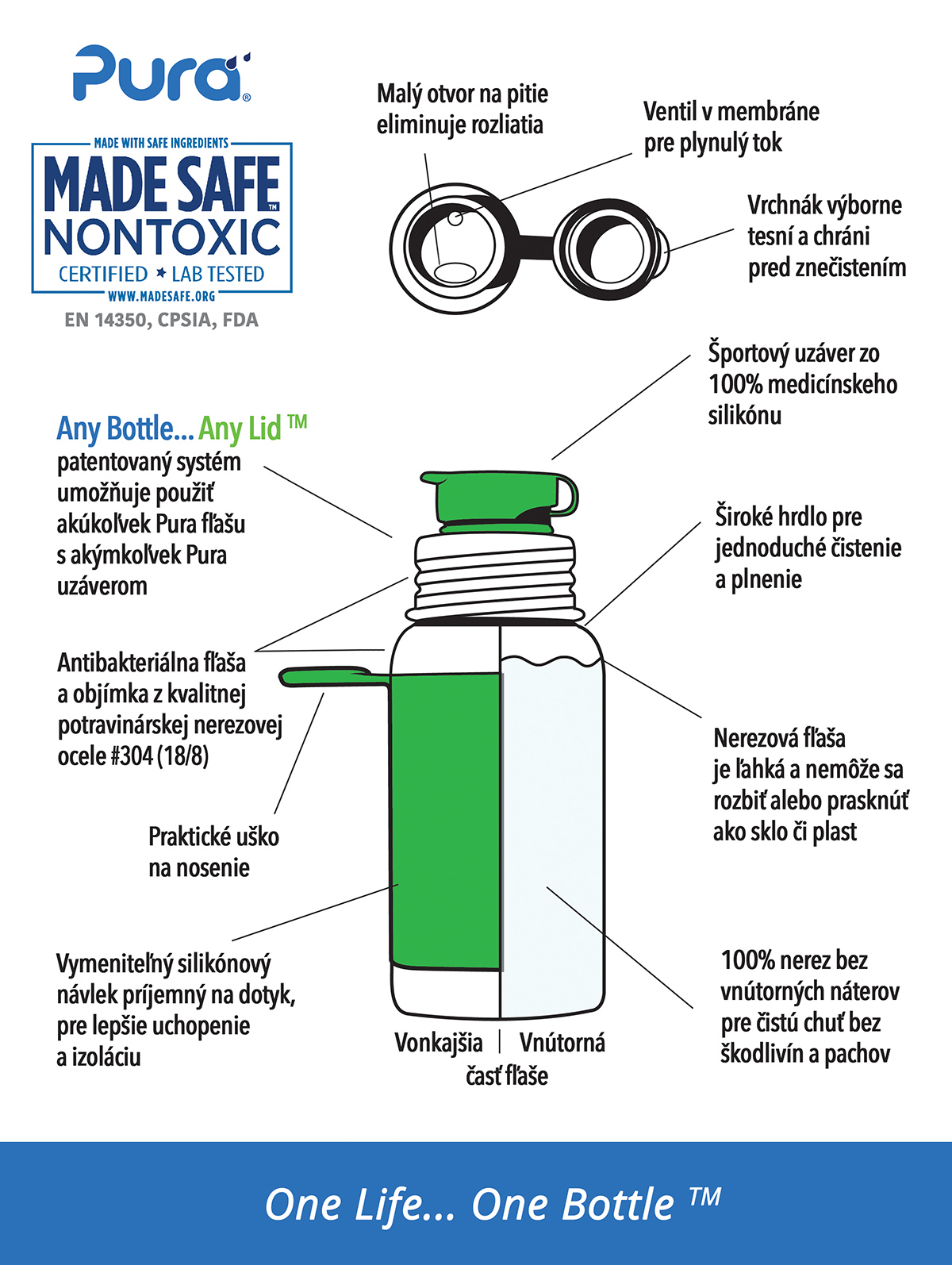 Nerezové láhve a termo láhve vyrobeny 100% bez plastových částí. Nejbezpečnější, nejuniverzálnější, nerozbitné ekologické láhve oceněné více než 35 oceněními. Jednoduchou výměnou silikonových uzávěrů se láhev mění z kojenecké láhve na láhev s náustkem, brčkem nebo sportovním uzávěrem či na skleničku na pokrmy. One Life… One Bottle™