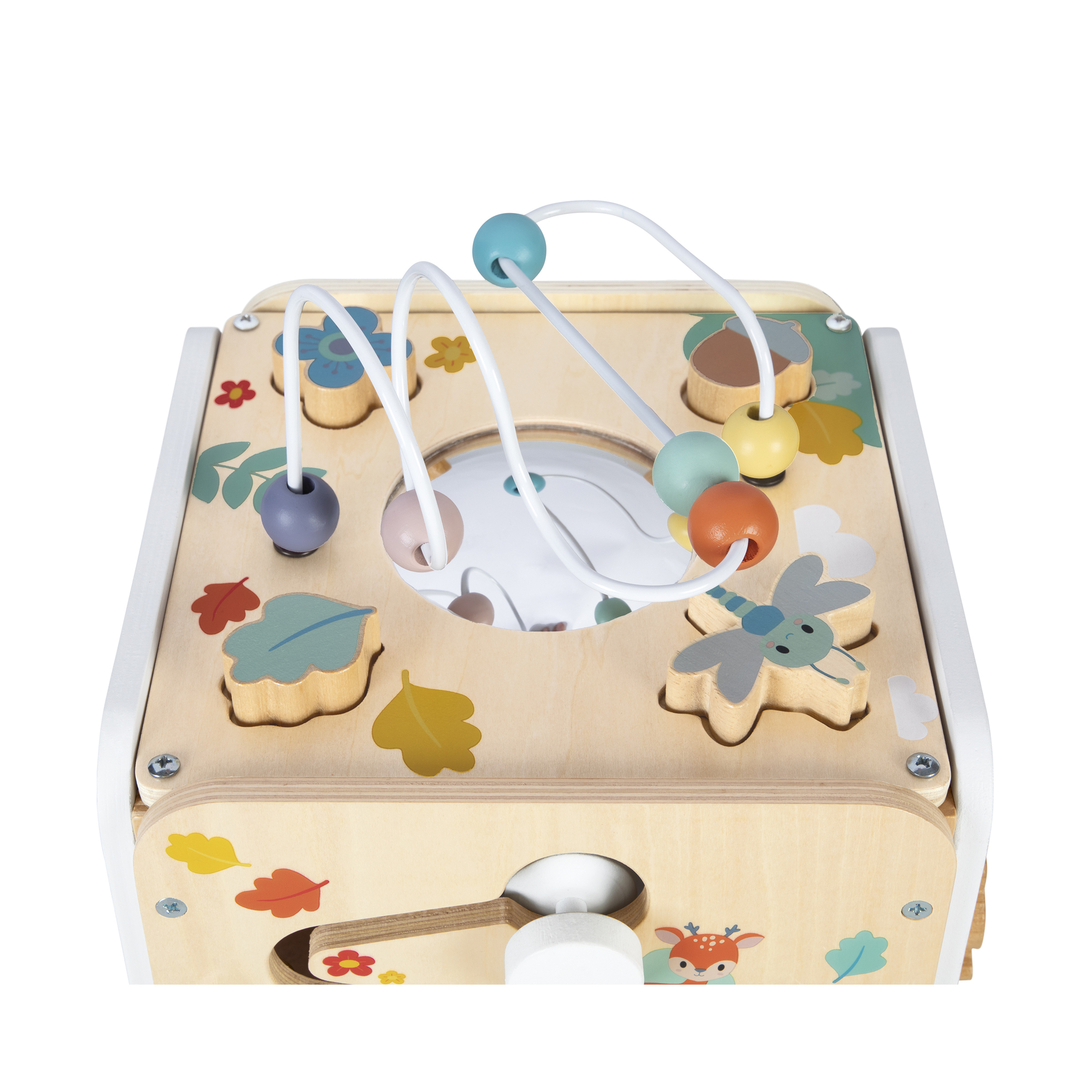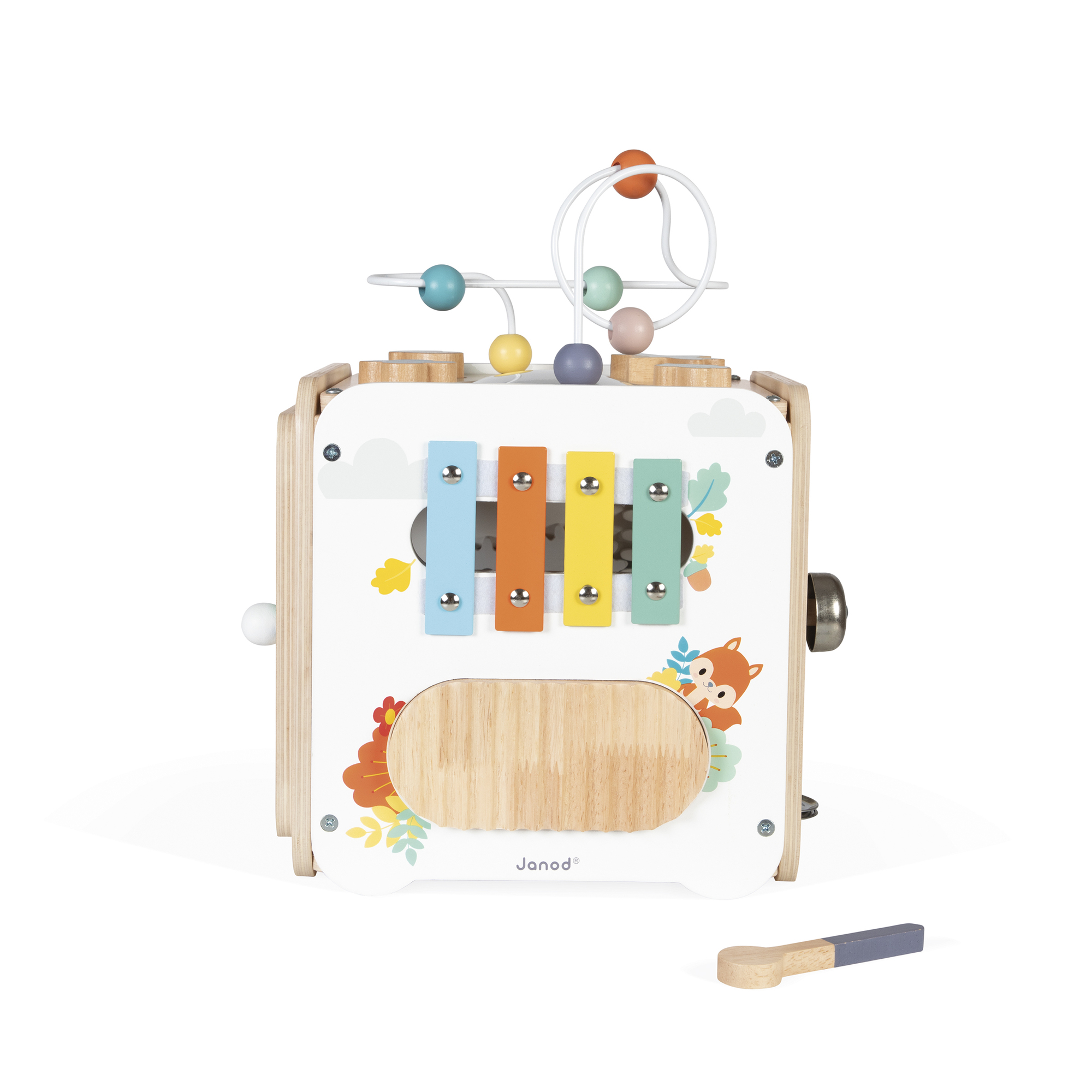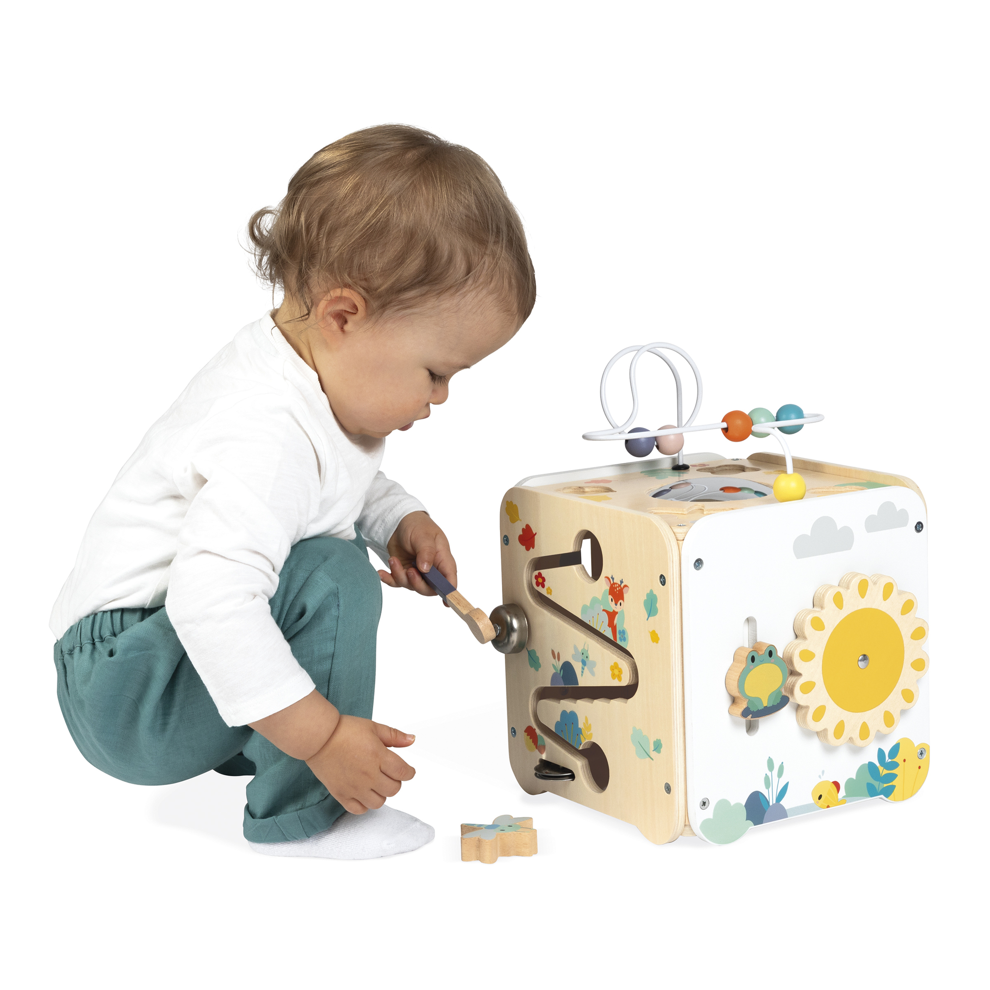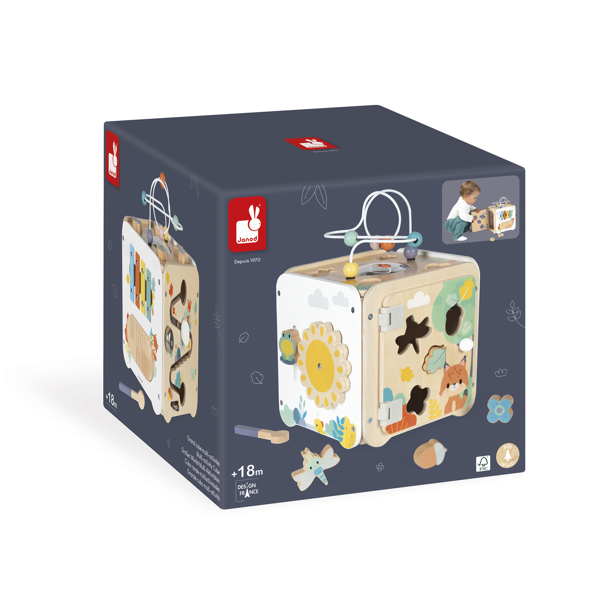 Prezrite si túto veľkú kocku a objavte všetky jej aktivity! Nájdete v nej roztomilé zvieratká z radu Pure. Na 5 stranách kocky je viac ako 8 aktivít na preskúmanie, vrátane: 1 kovového xylofónu s kladivkom, 1 škrabky, 1 vypuklého zrkadla, 1 hračky na rotáciu, 4 drevených figúrok (kvet, orech, vážka a list), ktoré sa dajú pripevniť na vrch alebo použiť s aktivitou triedenia tvarov na boku, 1 zlaňovacej hračky s navijakom, ktorý pri prechode zvoní zvončekom a činelami, a nakoniec 1 žaby, ktorá letí hore a dole a otáča slnko. Strana s triedením tvarov má magnetické dvierka, ktoré sa otvárajú a vyberajú figúrky vo vnútri. Upozorňujeme, že plastové pánty sa dajú ľahko znova nasadiť, ak sa dvierka odlepia. Rozvíja jemnú motoriku a koordináciu ruka-oko. Hračka pre rané vzdelávanie vyrobená z dreva FSC pre deti vo veku 18 mesiacov a viac.