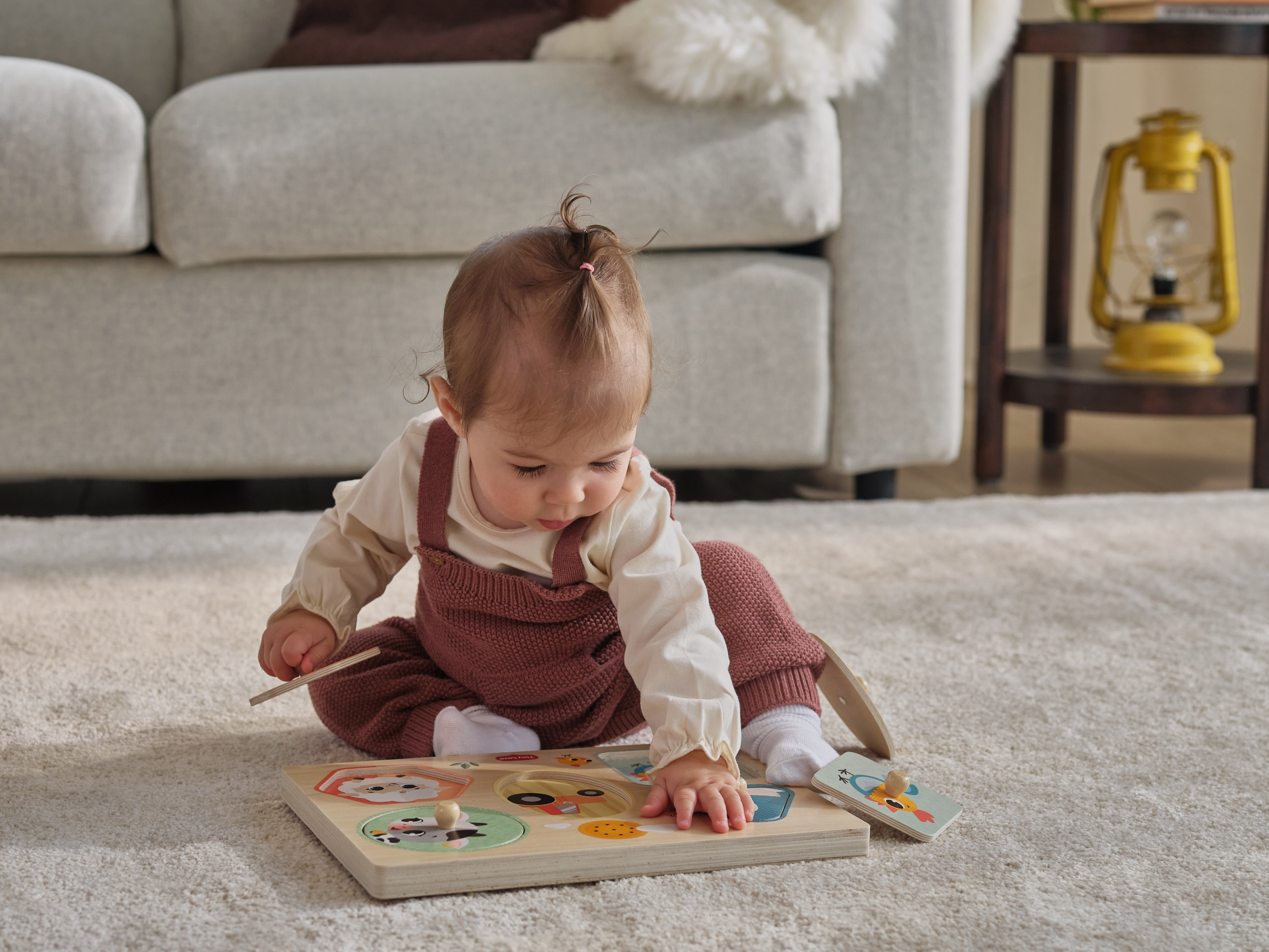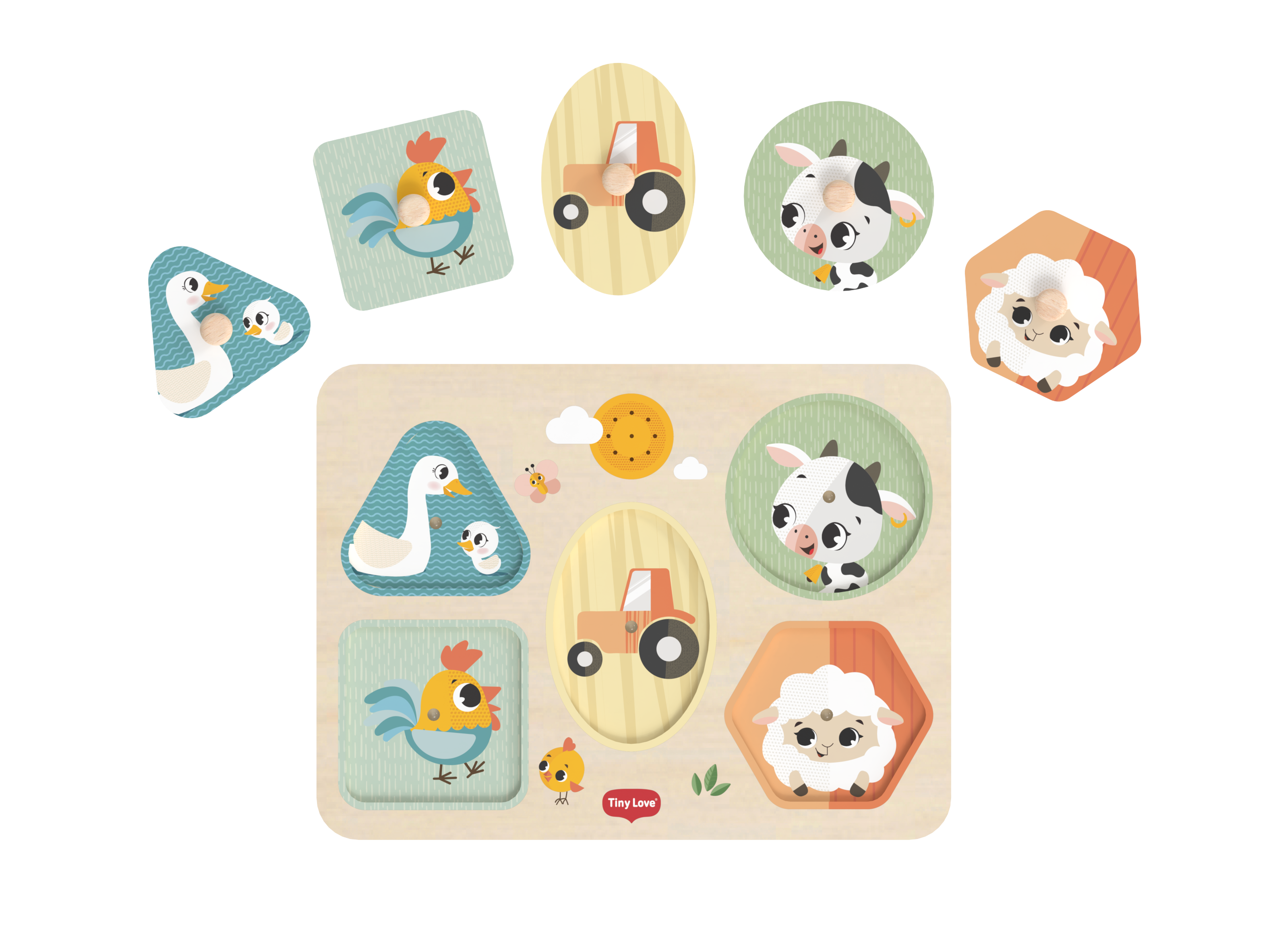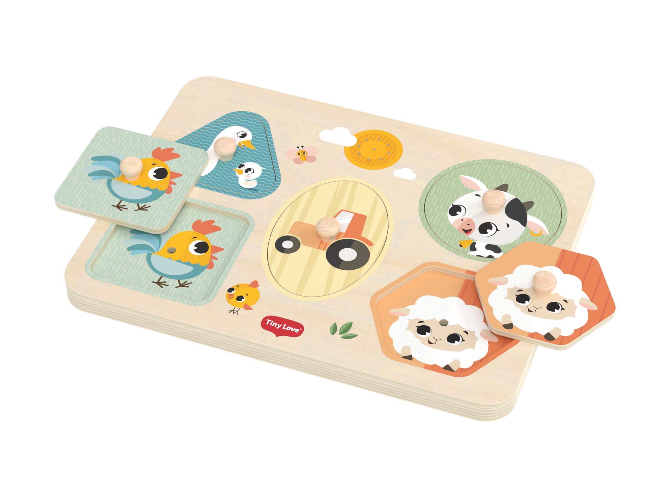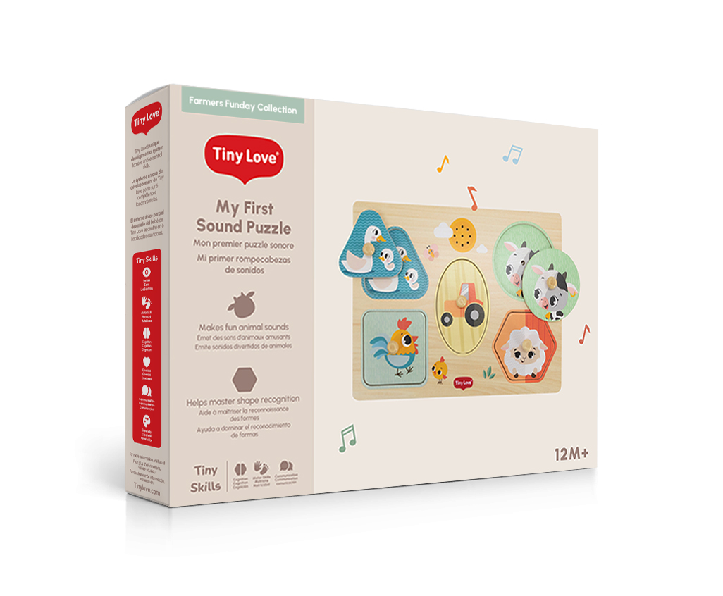 Dřevěné zvukové puzzle Tiny Love jsou zábavná vkládačka pro nejmenší, která učí děti rozpoznávat tvary, barvy a zvířátka. Pět velkých dílků různých tvarů s ilustracemi motivů ze života na farmě se díky úchytům snadno drží. Při vložení dílku na správné místo je dítě odměněno zvukem zvířátka, které je na dílku namalované. Dítě se tak učí vztahu "příčina - následek", uchopováním a vkládáním dílků se rozvíjí jeho jemná motorika a koordinace "ruka - oko".