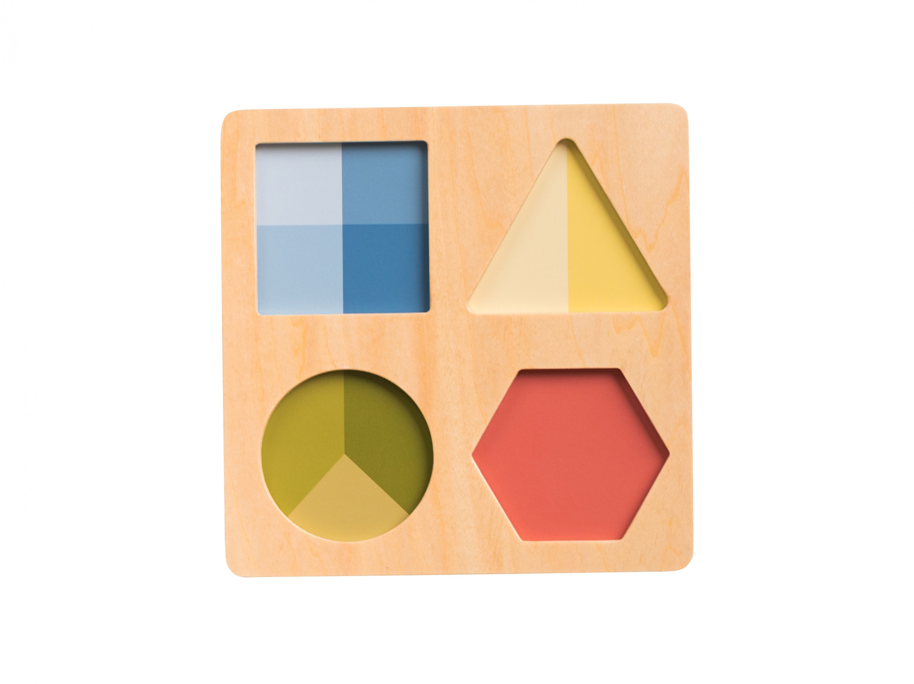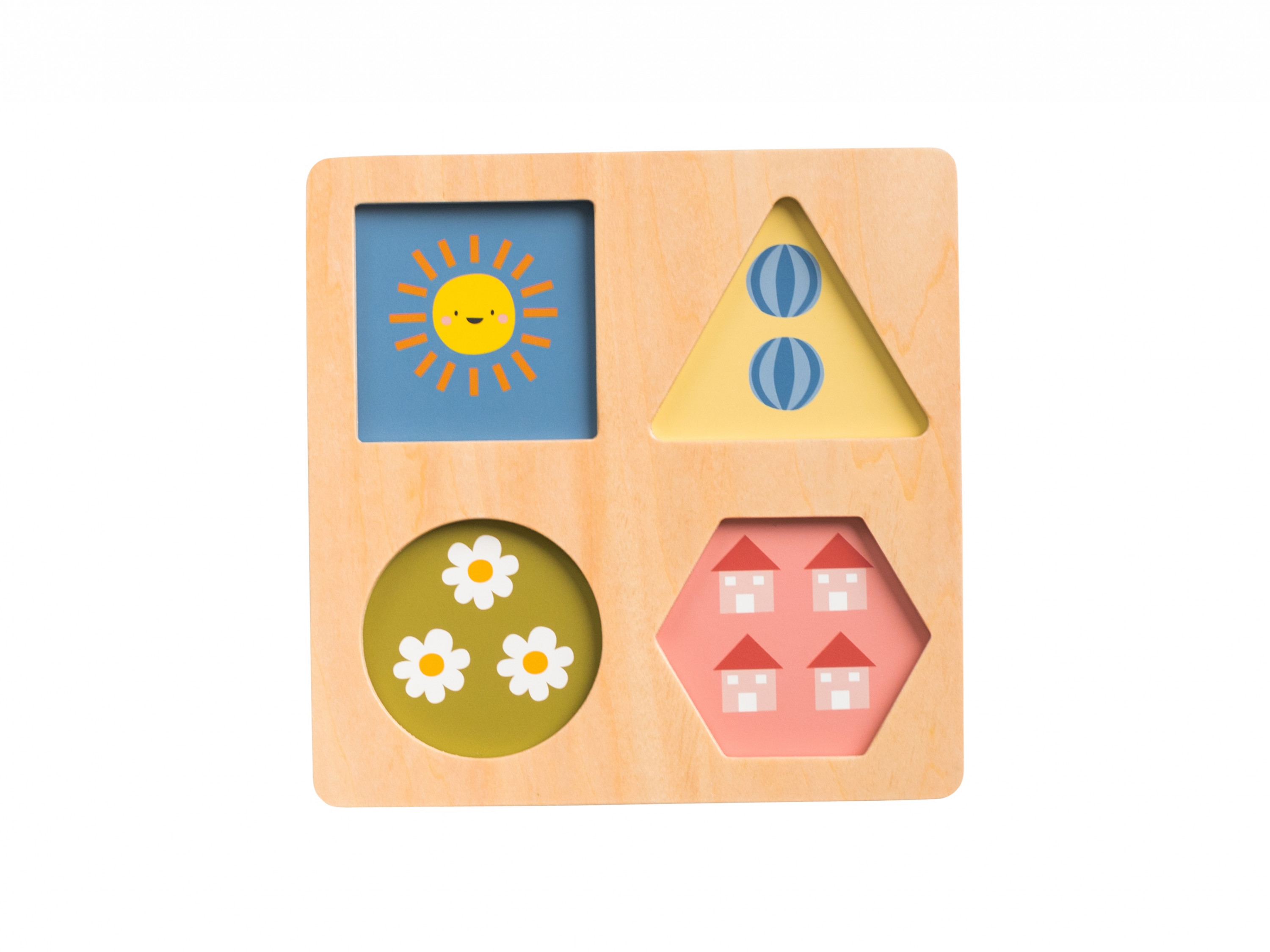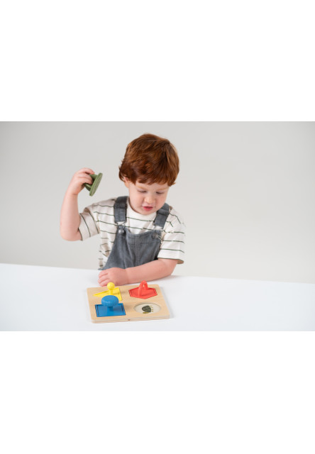 Vkládací puzzle různých tvarů s úchyty a výměnným pozadím v otvorech pomáhají učit dítě barvy, zvířátka, ovoce i počítání a rozvíjí jeho jemnou motoriku. Úchyty jednotlivých dílků mají různý tvar, takže vyžadují různé způsoby úchopu. Vkládací puzzle dílky můžete využít i jako razítka.