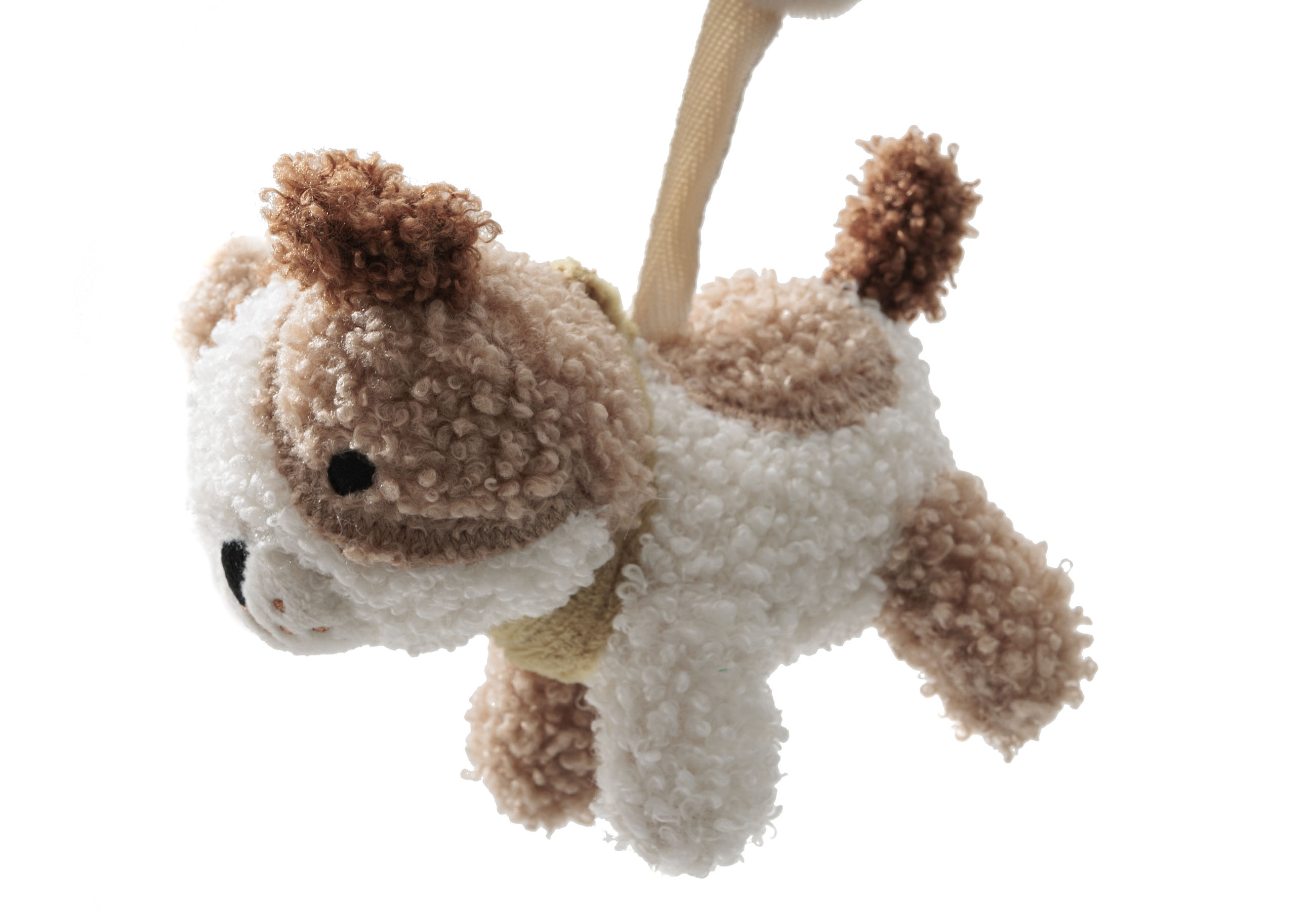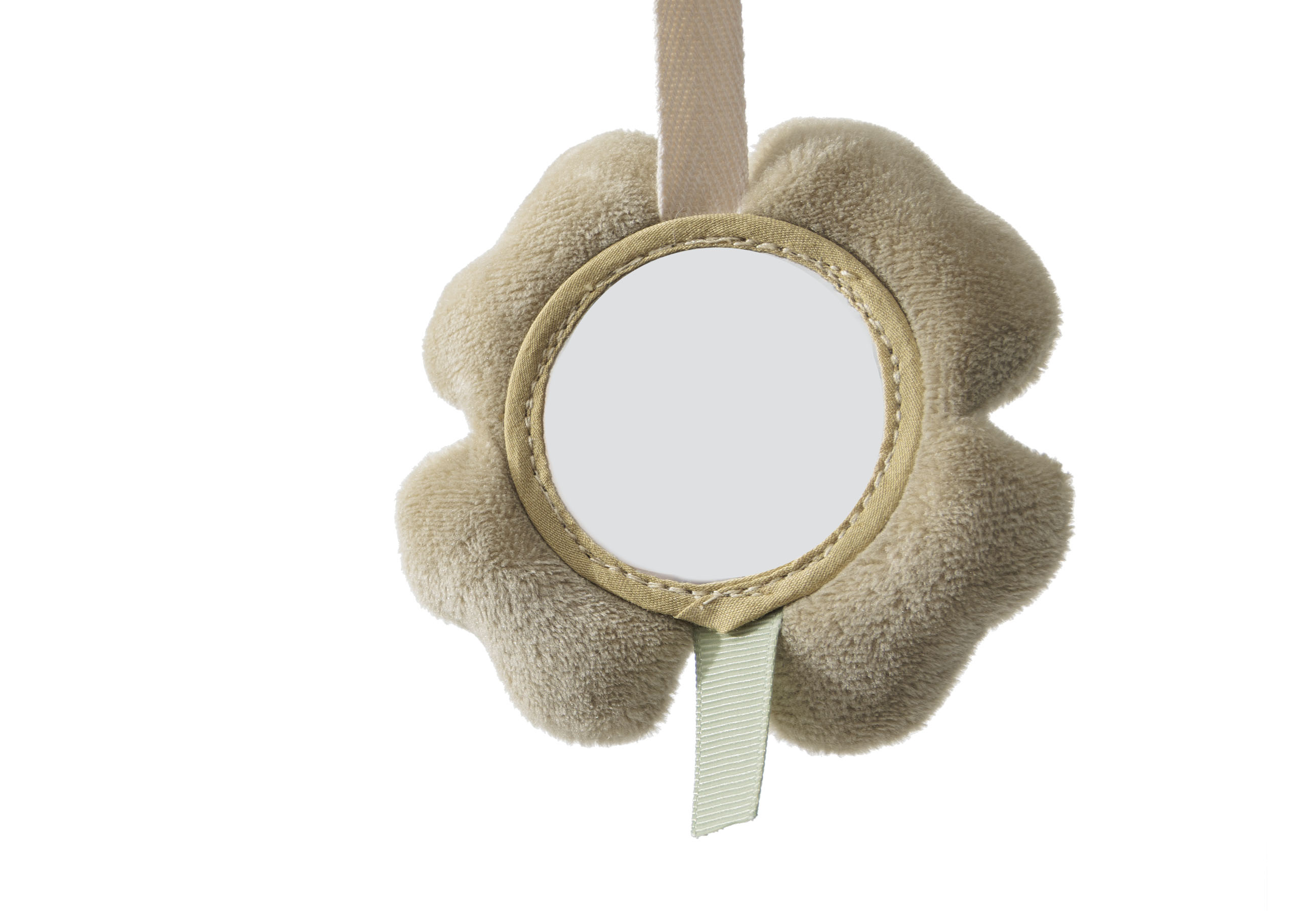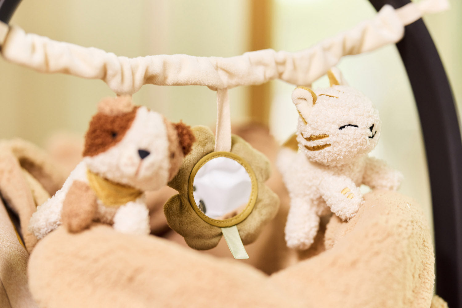 Řetěz na kočárek či autosedačku se zavěšenými hračkami v podobě pejska, kočičky a čtyřlístku s bezpečným zrcátkem zabaví vaše miminko v kočárku či autosedačce. Měkké hračky vyrobené z jemného plyše cinkají a nabízí různé textury pro zkoumání. Hračky stimulují koordinaci ruka / oko dítěte.