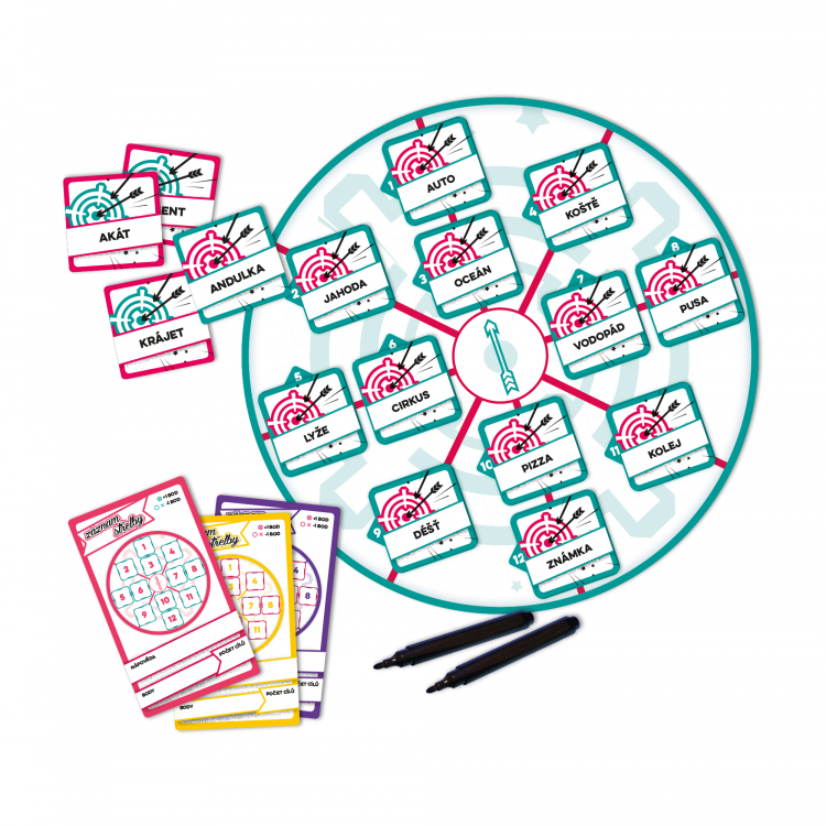 Zasiahnite myšlienky spoluhráčov... … dokážete nájsť slovo, ktoré spojí auto, cirkus a jahodu? V tejto rodinnej hre zvíťazí strelec, ktorý zvládne najlepšie napovedať a spájať slová. Vďaka rozdeleniu slov na ľahšie a ťažšie je hra prispôsobená deťom aj dospelým a pre hru dvoch hráčov ponúka kooperatívny variant. HERNÝ MECHANIZMUS: Každý hráč si vezme jednu kartičku pre záznam streľby. Na hernú podložku sa vyloží dvanásť kariet. Jeden z hráčov má úlohu spojára, vymýšľa teda jednoslovnú nápovedu, ktorou je možné prepojiť 3-8 slov vyložených na hernej podložke a zakrúžkuje na svoje doštičke príslužné slová. Potom prečíta nahlas ostatným hráčom (strelcom) svoju nápovedu. Strelci si na svojich kartičkách vyznačia slová, ktoré si myslia, že sa najlepšie hodia pre danú nápovedu a potom položia doštičky lícom nahor na stôl. Spojár následne prečíta slová, ktoré si zapísal. Strelci si započítajú bod za každé slovo, ktoré si vyznačili na karte a zároveň ho mal vyznačené aj spojár. Za slová, ktoré si vybral iba strelec a aj slová, ktoré mu chýbali a vybral si ich spojár si započítavajú mínusové body. Ak niekto zo strelcov uhádol všetky slová presne tak, ako si ich vyznačil spojár, získava navyše dva body za supertrefu. Hra končí, keď sa všetci hráči vystriedajú aspoň raz v úlohe spojára a víťazí hráč s najviac bodmi. OBSAH HRY: 200 obojstranných kariet 6 zapisovateľných kartičiek 6 zmazateľných fixiek 1 herná podložka pravidlá hry PARAMETRE PRODUKTU: Rozmery krabice: 18 cm x 22 cm x 4 cm