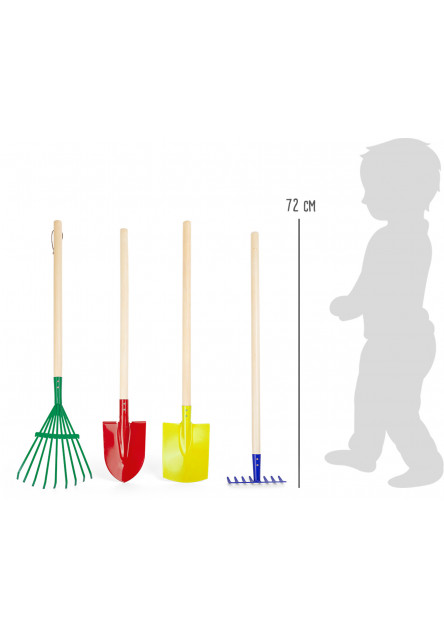 Zima je u konca! Je najvyšší čas, aby sa záhony pripravili na jar - alebo možno vytvoríte aj niekoľko nových? Pevná sada záhradného náradia obsahuje dvoje hrable, lopatu a rýľ. Vo svojich jasných farbách je vhodná pre akúkoľvek úlohu na záhrade. Živé farby a realistický dizajn uľahčujú mladým záhradníkom napodobňovať dospelých a učiť sa od nich. Po dokončení práce môžu byť nástroje riadne zavesené za povrazové konca. Toto záhradnícke náradie potrebuje už len kvety a pôdu! Hlavné vlastnosti: ideálna veľkosť pre detirozvíja motoriku a vzťah k prírodevyrobené z kovu, drevená násada