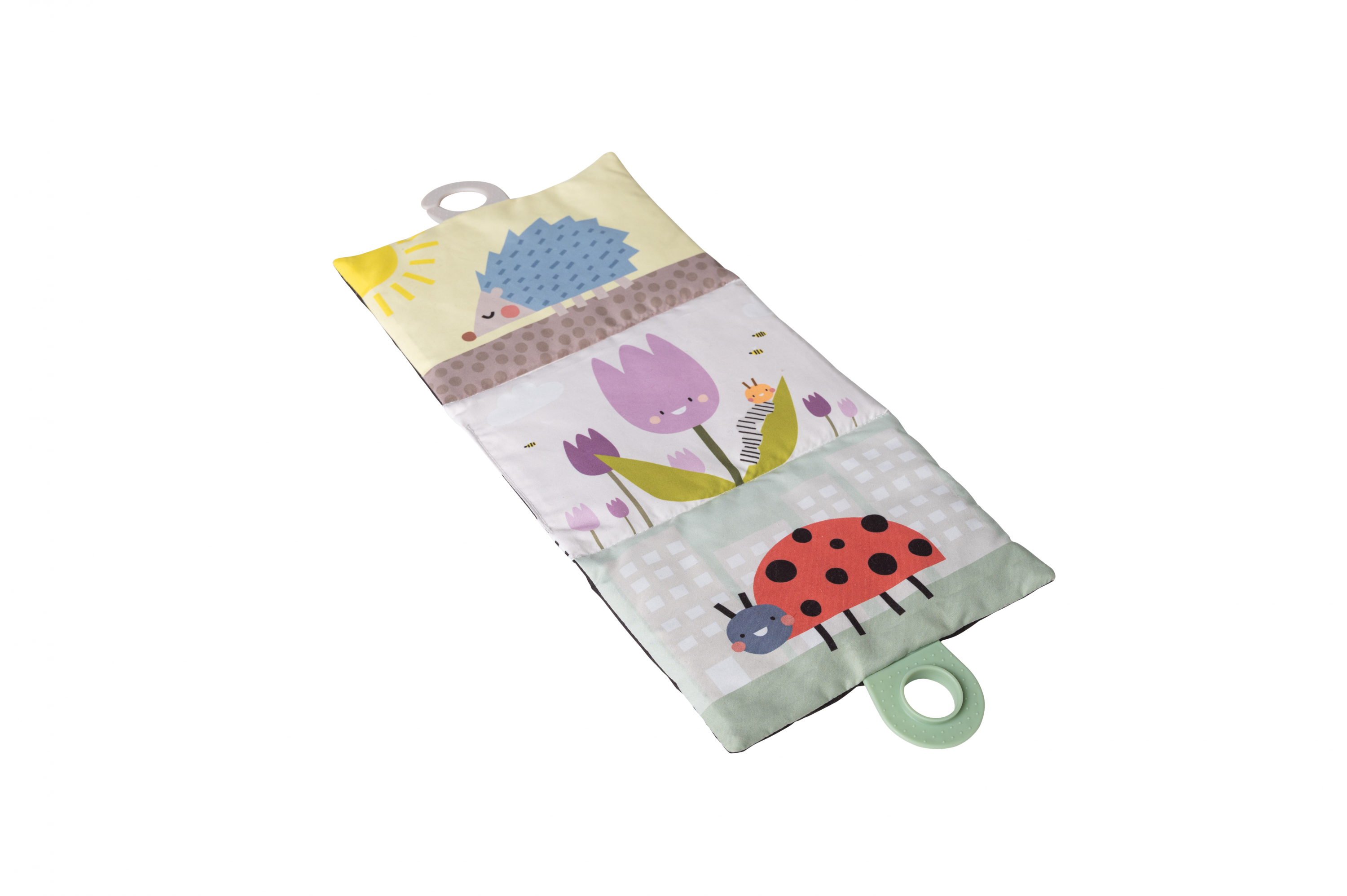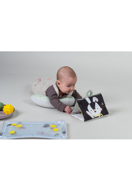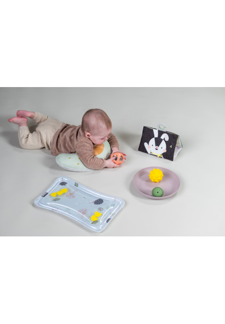 Polštářek z měkkého, příjemného materiálu je speciálně navržený, aby podporoval hraní dítěte na bříšku. Oboustranná šusticí kniha je ideální pro postavení před dítě v poloze na bříšku. Množství obrázků, které kniha nabízí, umožňuje rodičům obrázky vyměňovat a udržovat tak déle pozornost dítěte. Hru na bříšku podporuje i vodní hrací podložka s výraznými žlutými květinami, které se ve vodě při zmáčknutí podložky pohybují a upoutávají tak pozornost dítěte.