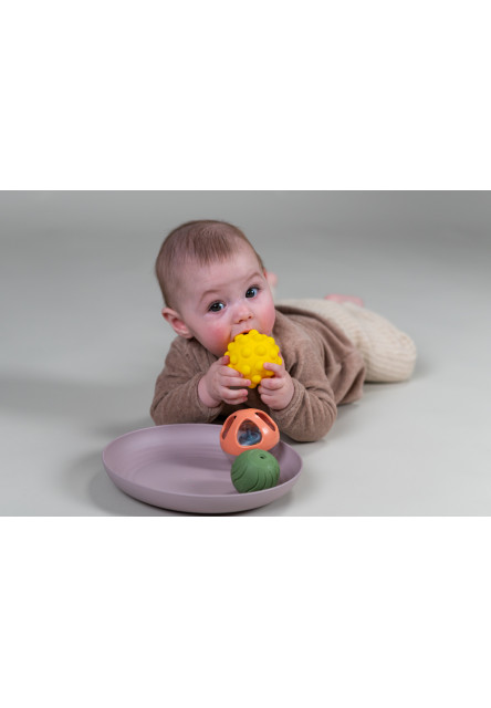 Tři senzorické míčky - průhledný s korálky, žlutý s výstupky a zelený s texturou - lákají ke zkoumání rukama i ústy. Podnos se zvýšenými okraji umožňuje umístit míčky před dítě, aniž by se mu rozkutálely.