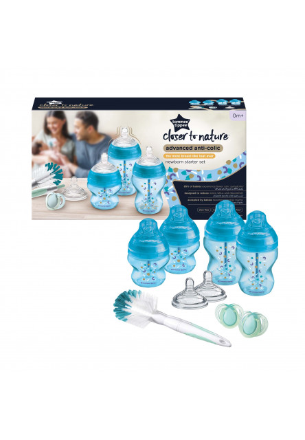 Výhodná sada kojeneckých lahviček Tommee Tippee ANTI-COLIC Advanced obsahuje 2x láhev 150ml se savičkou s pomalým průtokem 0m+, 2x láhev 260ml se savičkou s pomalým průtokem 0m+, 2x savičky se středním průtokem 3m+, 1x kartáč na láhve a savičky, 2x silikonové šidítko 0-6 měsíců.