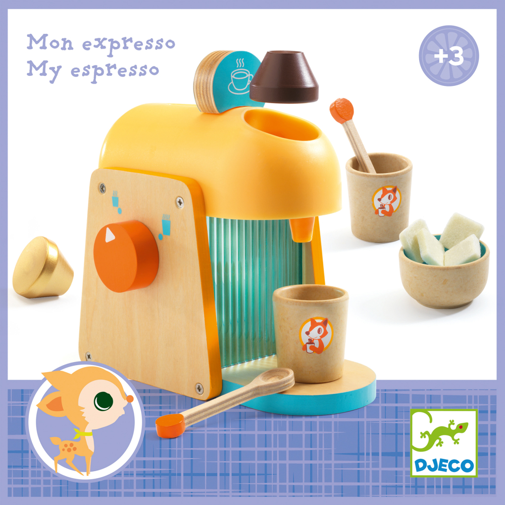Sada na rolovú hru. Drevený kapsulový kávovar s plastovými časťami. K tomu 2 šálky, lyžičky a cukornička s filcovými kockami cukru. Espresso alebo americano? Dieťa vloží drevenú kapsulu do kávovaru a keď je káva hotová, posunie modrú páčku vzad, aby kapsulu vybralo. Kolieskom na boku kávovaru si vyberie veľkosti kávy. Manipuláciou s dielmi súpravy si dieťa precvičuje motoriku, učí sa následnosť jednotlivých úkonov a kávičku môže aj pekne servírovať. Kávovar má estetický retro dizajn, ktorý polahodí oku.