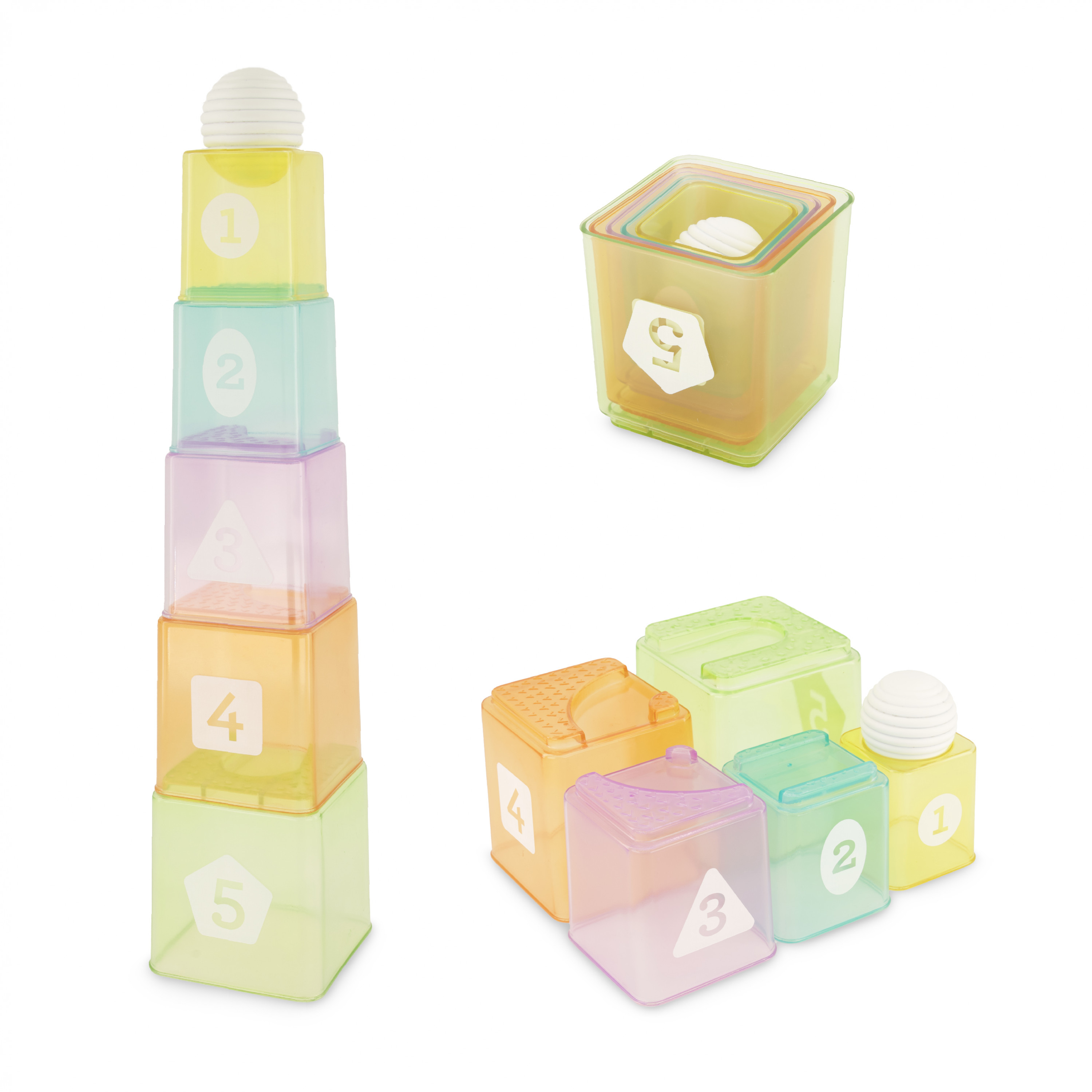 Sada obsahuje jeden míček a pět barevných stohovacích kelímků, které můžete stavět až do výšky nebo naopak vkládat do sebe. Průhledné kelímky jsou potištěné geometrickými tvary a čísly a můžete tak s jejich pomocí batole učit rozeznávat barvy, tvary i čísla. S míčkem můžete vymýšlet různé schovávací hry, kdy dítě bude např. hledat míček ukrytý pod kelímky.