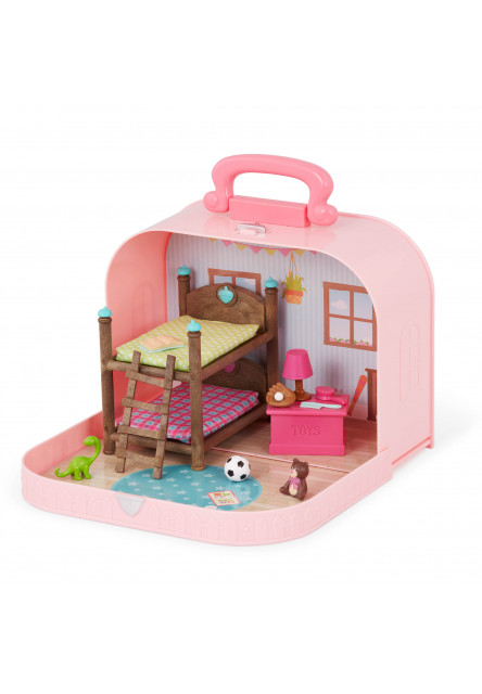 Cestovní sada hraček Li'l Woodzeeze v praktickém kufříku umožní vašemu dítěti hrát si kdekoli na dovolené, výletech či během víkendu u prarodičů. Kufřík se po otevření promění v bohatě vybavený dětský pokoj s nábytkem a doplňky.