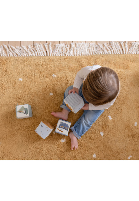 Sada čtyř měkkých plyšových kostek z kolekce Little Dutch Námořnický záliv obsahuje krásné motivy ze života na rmoři a nabízí mnoho aktivit, které lákají ke zkoumání a stimulují smysly dětí.