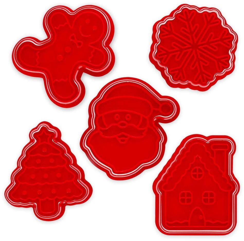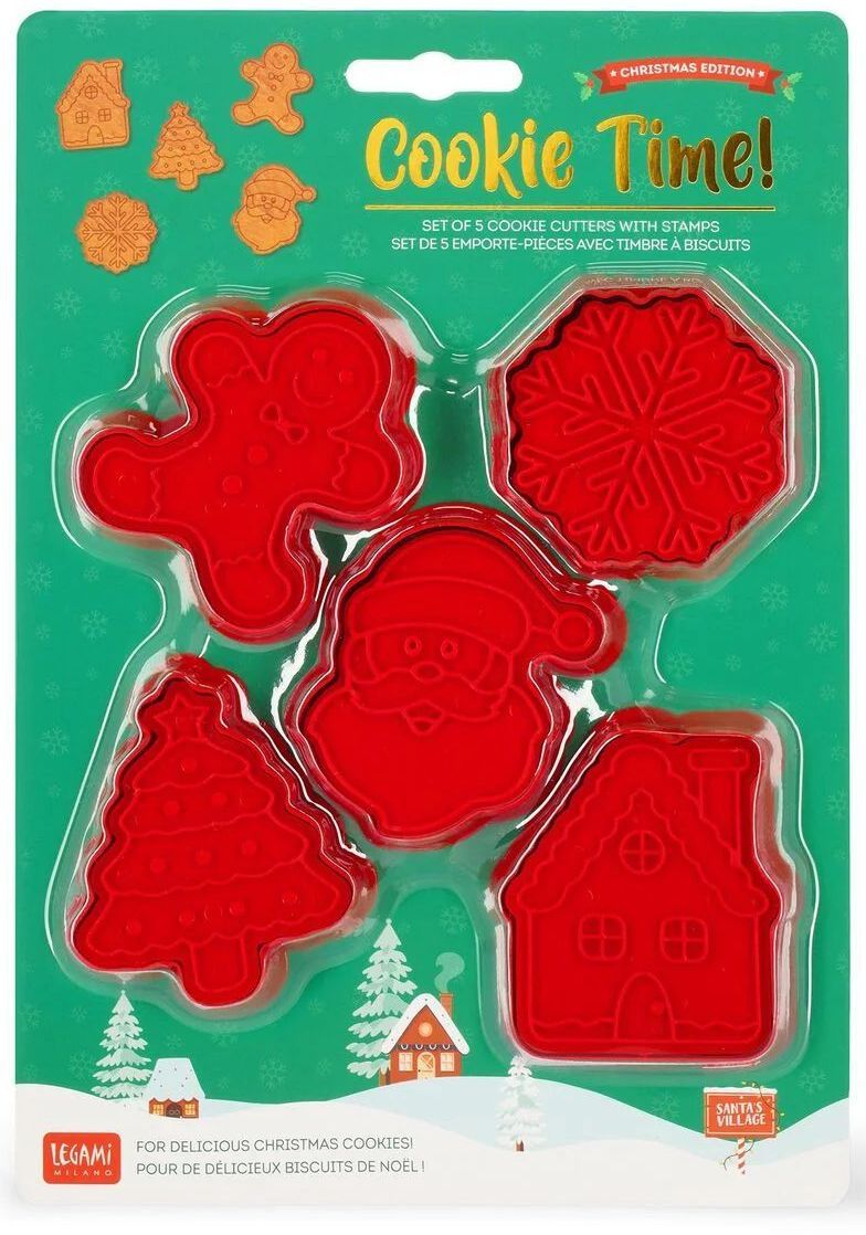 Set vykrajovačov na pečivo Legami Cookie Time s piatimi rôznymi vianočnými tvarmi a pečiatkami na ozdobenie cesta.