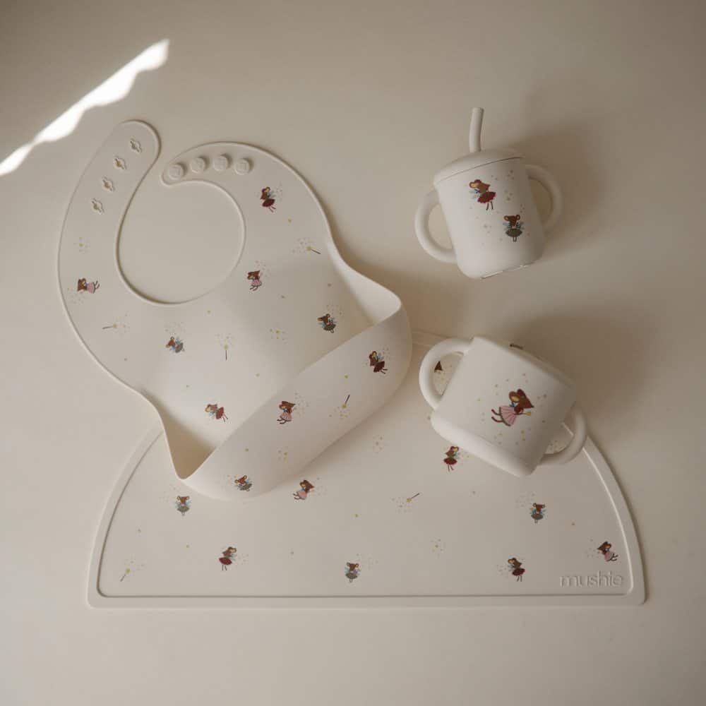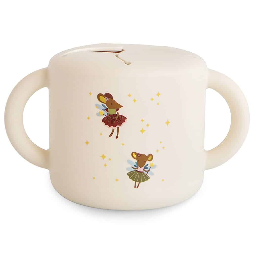 Mushie snack pohárik v jemnej farbe s krásnym dizajnom Fairy Mice.