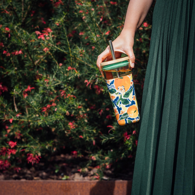 Quokka Skleněný cestovní hrnek s brčkem Liquid Cube Oranges 540 ml