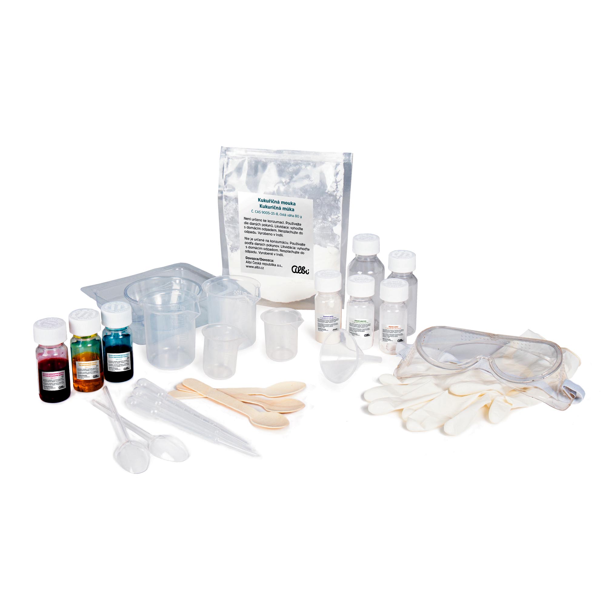 S experimentálnou sadou Slizové laboratórium z edície Albi Science si môžete vyrobiť rôzne druhy slizu, napríklad nechutne tekutý alebo super nadýchaný sliz, alebo skákajúcu želatínovú loptičku. Viete, z čoho všetkého sa dá sliz vyrobiť? Čo napríklad želatínové cukríky? Naučte sa správne odmerať chemické látky, či už sú sypké alebo kvapalné. Dozviete sa, ako správne odmerať kvapalinu v prípade, že nemáte váhu alebo odmerku. Slizové laboratórium naučí deti od 6 rokov základom práce v laboratóriu a postup pri pokusoch. A zistí tiež potrebné, čo je to skupenstvo a viskozita látok. Sada Slizové laboratórium obsahuje: modré potravinárske farbivo 15 ml, žlté potravinárske farbivo 15 ml, červené potravinárske farbivo 15 ml, kukuričnú múku 80 g, 2 veľké odmerky, 2 malé odmerky, 3 kvapkadlá, ochranné okuliare, ochranné rukavice, 3 plastové lyžičky drevené lyžičky, 2 plastové nádobky, 2 veľké odmerky, 2 malé odmerky, 2 fľaštičky s uzáverom, chlorid vápenatý 8 g CAS10035-04-8, alginát sodný 8 g CAS9005-38-3, guarová guma 10 g 9000-30-3 a návod. UPOZORNENIE: Venujte pozornosť úprave návodu na skákajúcu loptičku. Použite 15ml teplej vody. Loptičku nechajte vyschnúť cez noc, potom je pripravená k hre. Kompletný upravený návod je k dispozícii v Prílohách na stiahnutie. K dispozícii je aj videonávod v galérii. Ospravedlňujeme sa za prípadné komplikácie pri výrobe. Návod bude v ďalšej dotlači opravený. Doplnenie surovín do sád ALBI Science V experimentálnych sadách pre deti od ALBI Science nájdete určité množstvo surovín, ktoré vystačia na otestovanie všetkých pokusov. Baví vás testovať ďalej alebo plánujete prizvať kamarátov? Potom je potrebné doplniť zásoby. Prinášame pár tipov, kde suroviny nájsť. Kukuričný škrob, guarovú gumu ľahko dokúpite takmer v každých potravinách a predajniach so zdravou výživou. Navštívte e-shop alebo predajne Country Life, či https://www.vitalcountry.cz/. Alginát sodný, prírodný extrakt z hnedej riasy zaobstaráte na e-shopoch zameraných na predaj potravinárskych surovín, napr. https://www.drhoffmann.cz/. Pre viac ochranných rukavíc sa zastavte v drogérii alebo lekárni. Tie nájdete aj v ďalších ALBI Crafts&Science sadách, preto vezmite rovno celý balík. Stiahnite si prehľadný nákupný zoznam.