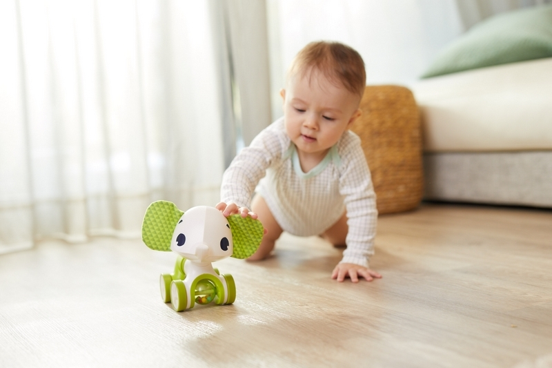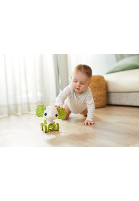 Roztomilá hračka v podobě slona s natahovacím harmonikovým tělem a otočnými kolečky zabaví dítě od prvních momentů na bříšku přes lezení a samostatné sezení až po první krůčky.