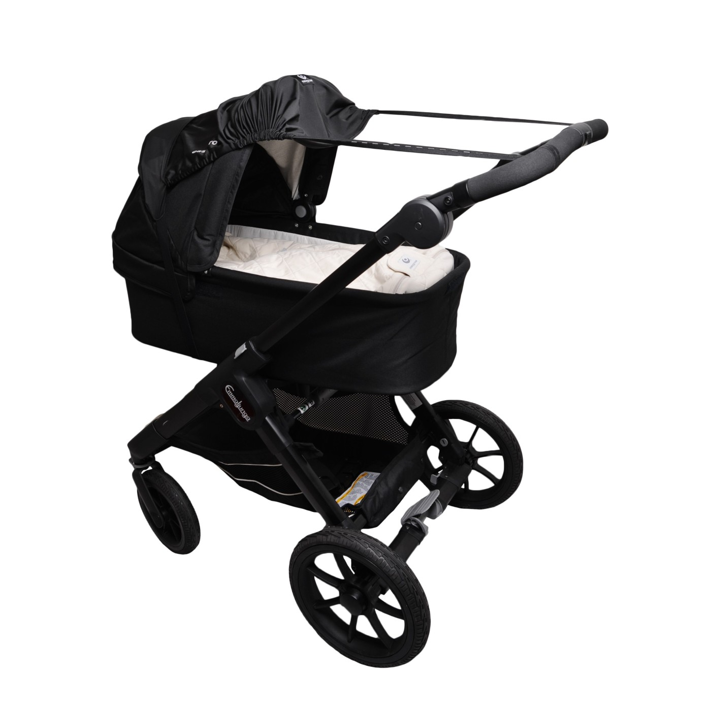 • Upevnění přes stříšku pomocí elastického pásku pod opěrkou nebo korbičkou
