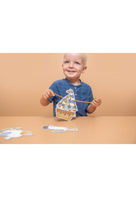 Sada pěti kartonových karet s otvory pro provlékání šňůrek je originální hračkou, která vaše dítě zabaví a zároveň podpoří jeho kreativitu i trpělivost. Karty v podobě parníku, plachetnice, majáku, racka a pelikána jsou vyrobené z kvalitního pevného kartonu a množství otvorů nabízí nekonečné množství způsobů provlékání šňůrky. Šňůrka v podobě tkaničky s plastovým zakončením umožňuje snadné navlékání i malým dětským ručičkám.