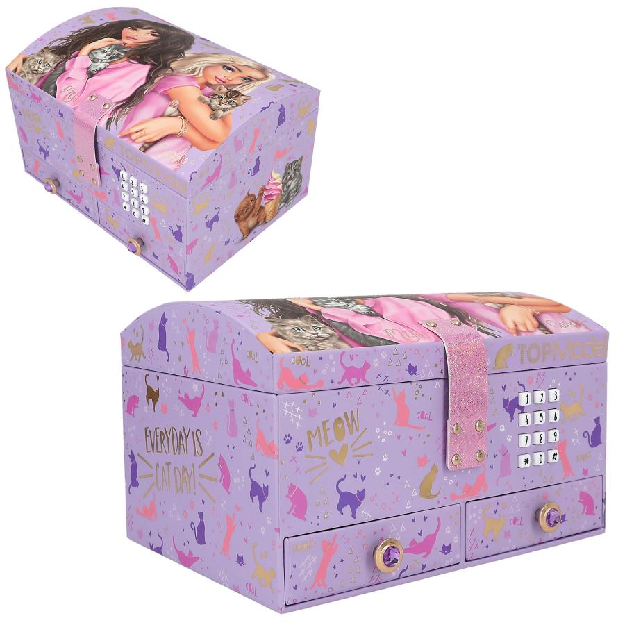 Kvalitne spracovaná dievčenská šperkovnica značky Top Model vyrobená z pevného kartónu so zrkadielkom a elektronickým zámkom. Pri otvorení tajným kódom zahrá hit Shivers. Šperkovnica ponúka veľký vnútorný priestor pre prehľadné uloženie všetkých šperkov! Horné poschodie je rozdelené odnímateľnou priehradkou pre uloženie prstienkov a náušníc. Spodné vnútorné zásuvky sú ideálne na menšie šperky. Obľúbený dizajn nadchne všetky dievčatá! Batérie: 3 x LR44 / AG13 (sú súčasťou balenia). Rozmery: 15,7 x 20 x 12,5 cm.