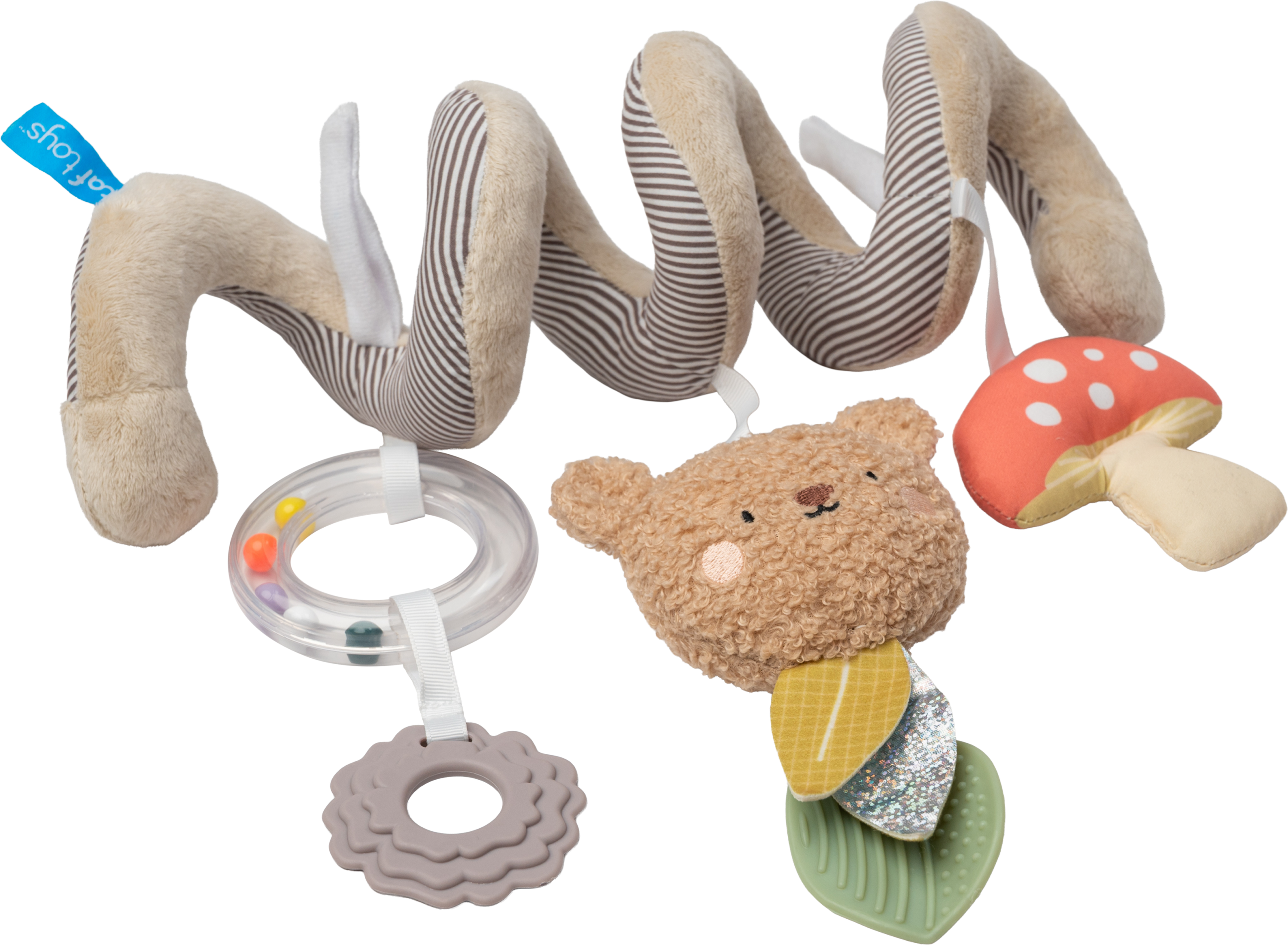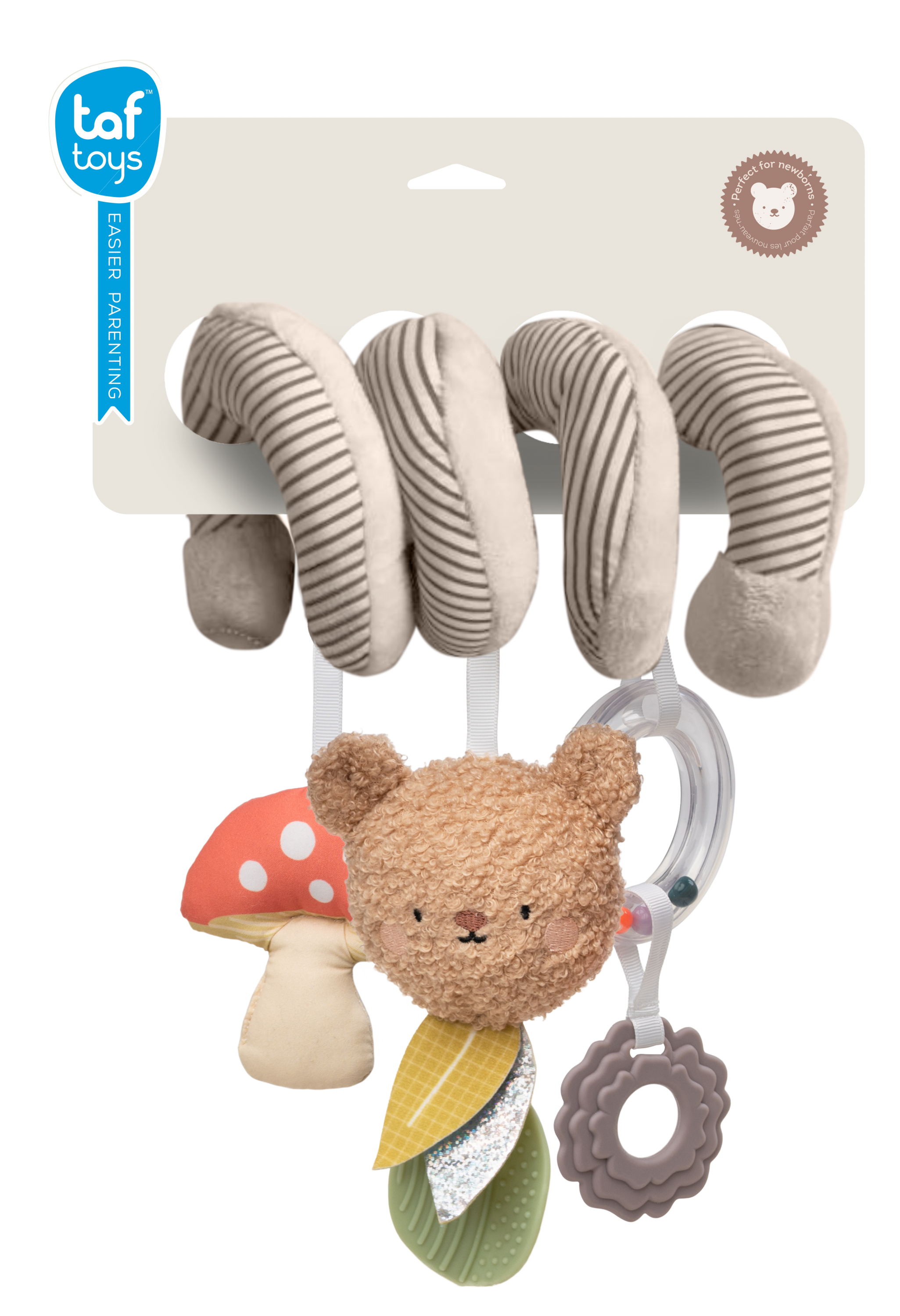 Spirála Taf Toys Bear Hugs je multi-senzorická hračka, která zabaví vaše miminko od narození doma i na cestách. Díky spirálovému tvaru ji snadno upevníte na kočárek, postýlku nebo autosedačku. Pozornost dítěte upoutá kombinace měkkých plyšových hraček s kousátky a chrastítky. Zavěšené hračky z různých materiálů podporují klidné zkoumání rukama i očima a pomáhají rozvíjet první dovednosti během každé procházky i odpočinku doma.
