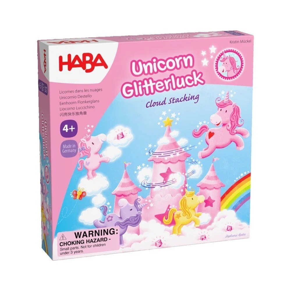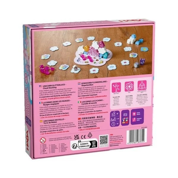 Počet hráčov: 1-4 hráči Čas hry: 15 minút Päť malých jednorožcov, Glitterluck, Rosalie, Marvel Flower, Magic Swirl a Stardust, žije v krásnom oblačnom hrade. Každý deň ich prichádzajú navštíviť priatelia; vždy je tam veľa návštevníkov a veľa sa deje a v hrade sa začína stávať málo miesta. Pomocou množstva oblakov a trochy mágie jednorožce postupne pridávajú k svojmu hradu ďalšie vežičky. Cieľom hry je nazbierať 10 ružových kryštálov, poukladať oblaky a jednorožce na hrad, aby sa všetky jednorožce usadili v ich novom domove! Hráči hodia kockou a posunú Rosalie o zodpovedajúci počet dlaždíc vpred, alebo ak dopadnú na hviezdu - poletia na ľubovoľné dlaždičkové políčko podľa vlastného výberu. Dlaždica, na ktorej pristanete, určuje váš ťah. Pristanete na oblaku, poukladajte zodpovedajúci biely alebo modrý oblak na hrad. Pristanete na jednorožcovi, poukladajte na hrad ktoréhokoľvek z Rosaliiných priateľov jednorožcov. Pristanete na drahokame, umiestnite kryštál do zapustenej hracej dosky. Čo sa stane, keď súčiastky spadnú? Nebojte sa, súčiastky sa vrátia do zásoby, kryštály zostanú na mieste a hráč musí otočiť kartu oblaku... čo odhalí? Slnko = to prináša šťastie, búrka = pozor! Hráči pracujú ako tím a spoločne vyhrávajú, keď sú všetci jednorožci a Rosalie naskladaní a všetkých 10 kryštálov je nazbieraných. Spoločne prehrávajú, ak sú predtým, ako dosiahnu svoj cieľ, otočené 3 búrky. Obsah: 5 jednorožcov: Glitterluck (jarkoružový), Stardust (žltý), Marvel Flower (fialový), Magic Swirl (tyrkysový) a mláďa jednorožca Rosalie (ružová), 1 obláčikový hrad, 5 veľkých bielych oblakov a 5 menších modrých oblakov, 1 kocka, 1 hracia doska s oblakmi, 16 obojstranných obláčikových dlaždicí, 10 obláčikových kryštálov a návod na použitie. Vek: 4 roky a viac
