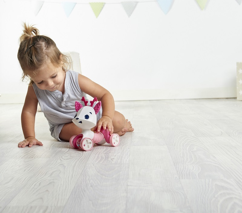 Něžná hračka v podobě kolouška s natahovacím harmonikovým tělem a otočnými kolečky zabaví dítě od prvních momentů na bříšku přes lezení a samostatné sezení až po první krůčky.