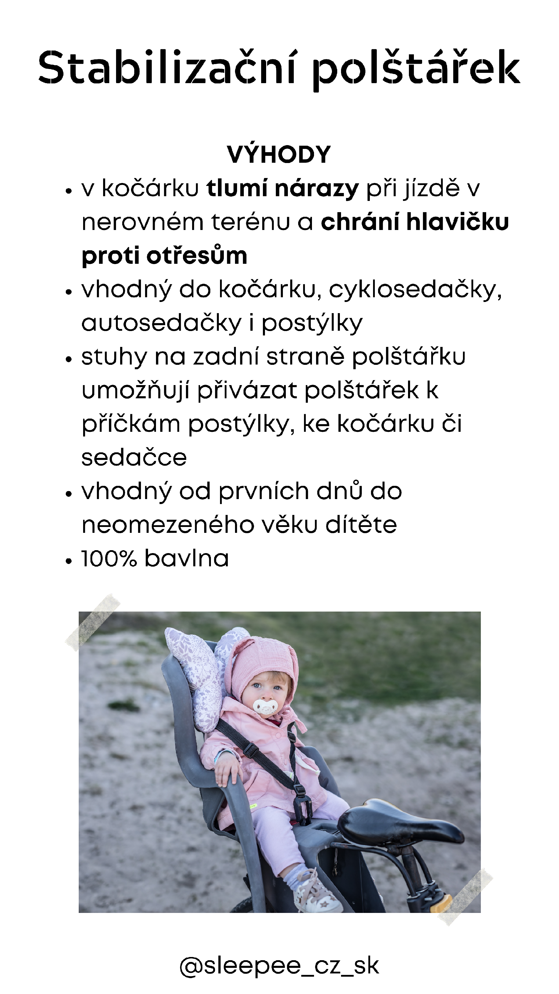 Polštářek doporučujeme při jízdě s kočárkem po nerovném povrchu, protože výrazně tlumí otřesy hlavičky a pomáhá děťátku klidně a nerušeně spát.