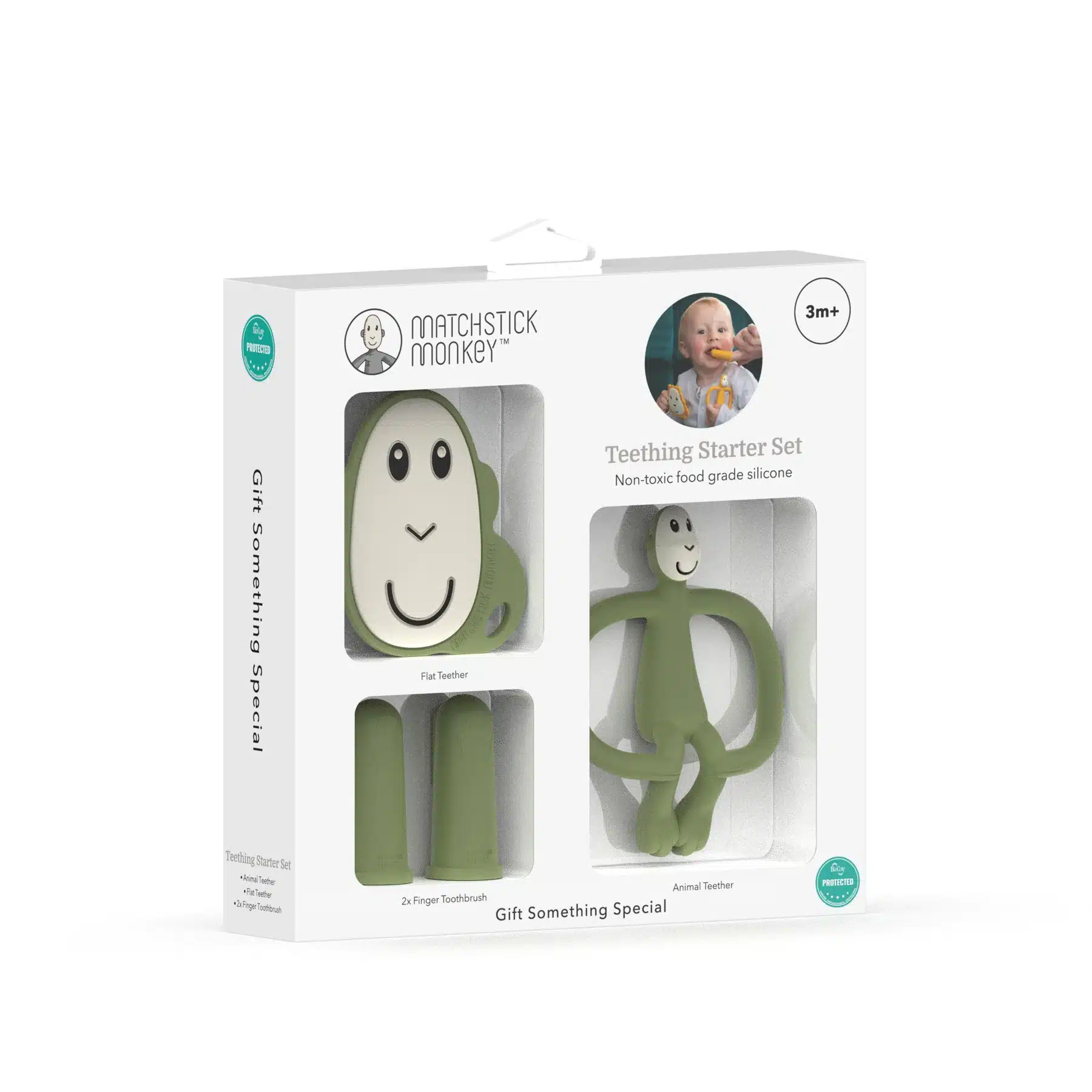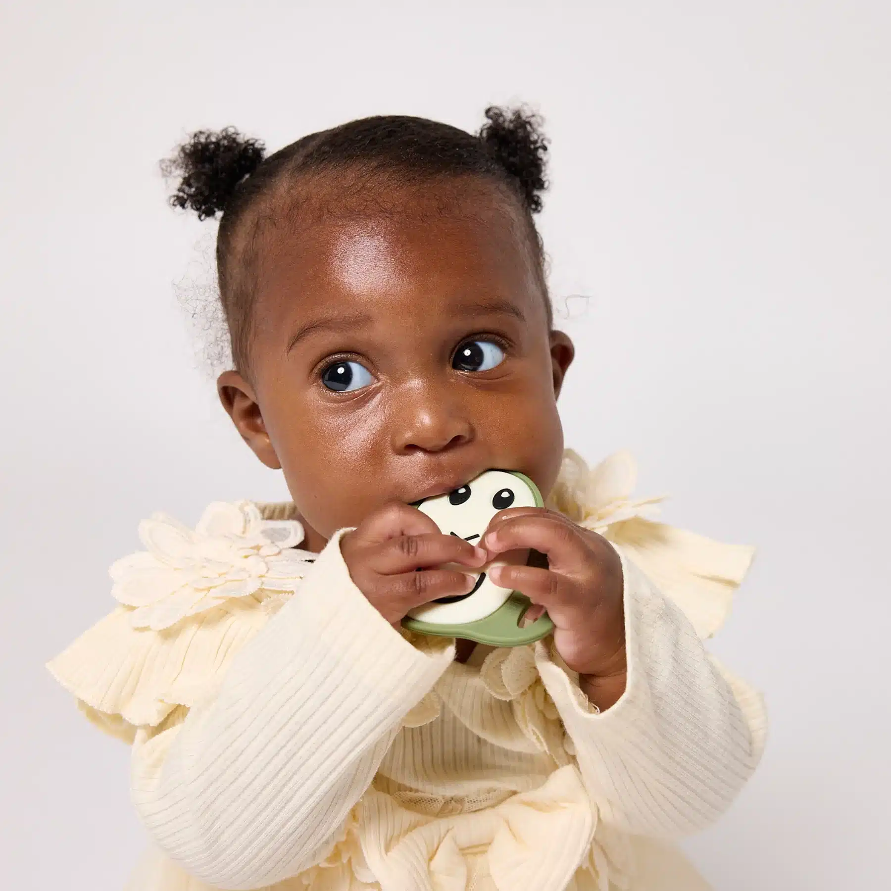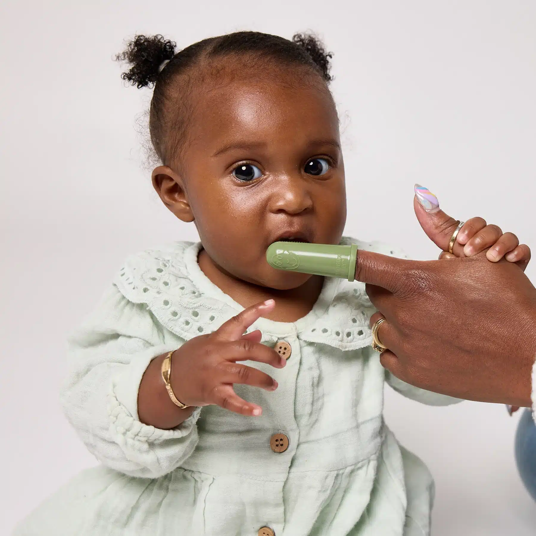 Olivovo zelené hryzadlo v tvare opičky je zábavné, flexibilné a vďaka textúrovaným výstupkom rýchlo zasiahne miesto bolesti. Plochí opičí kamaráti sú malí, ľahučkí a ideálni do drobných detských ručičiek – skvelí na cesty alebo do tašky. Silikónové prstové kefky sú ideálnou prvou zubnou kefkou pre bábätko – jemné a šetrné k ďasnám.