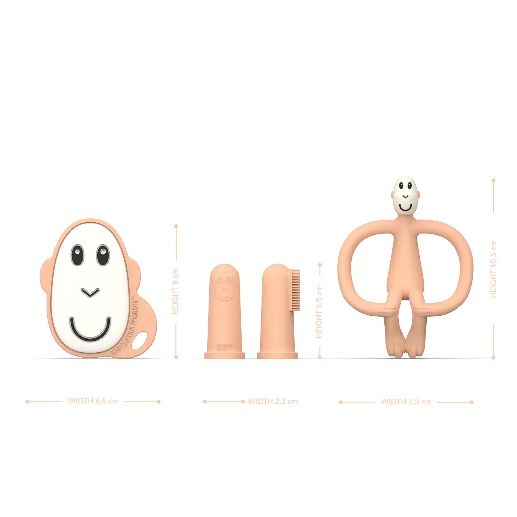 Broskyňové hryzadlo v tvare opičky je zábavné, flexibilné a vďaka textúrovaným výstupkom rýchlo zasiahne miesto bolesti. Plochí opičí kamaráti sú malí, ľahučkí a ideálni do drobných detských ručičiek – skvelí na cesty alebo do tašky. Silikónové prstové kefky sú ideálnou prvou zubnou kefkou pre bábätko – jemné a šetrné k ďasnám.