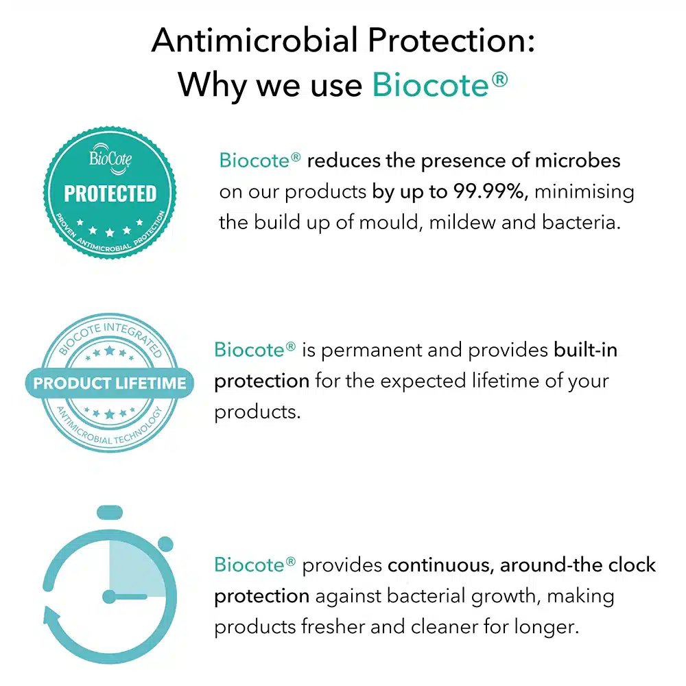 Všetky produkty obsahujú BioCote® antibakteriálnu ochranu, ktorá redukuje množstvo mikróbov na povrchu, takže zostávajú čistejšie a sviežejšie ako bežné hryzadlá.