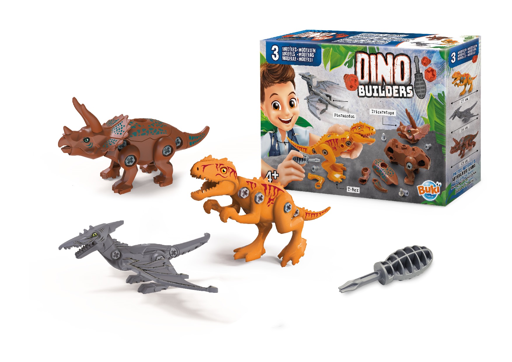 Stavebnice troch dinosaurov pre milovníkov dinosaurov, ktorí radi majstrujú. Pomocou priloženého skrutkovača si z niekoľkých dielov zostavíte tri dinosaurami (Pteranodon, T-rex, Triceratops).